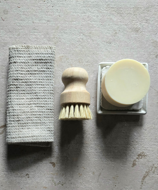 Natural Kitchen Cleaning Kit-Gift Set-Pure Linen Wash Cloth,Handmade Ceramic Dish, Round House Soap & Brush for Cleaning Kit for House Warming Gift Box for Kitchen Tea Bundle Rustic Eco Friendly Cleaning Products for the House Cleaning