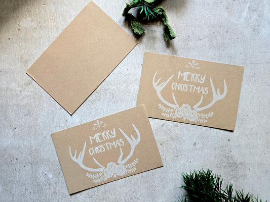 Kraft “Merry Christmas” Gift Tag- Packs Of 10 — White Script & Deer Antlers, Rustic Holiday Tag
