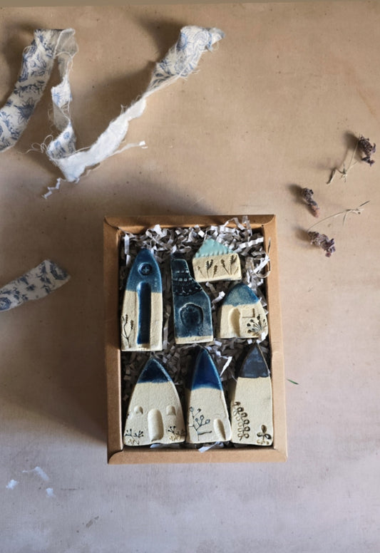 — Handcrafted Little Houses — the Blue & Natural Collection Gift-Boxed & Truly Unique-
