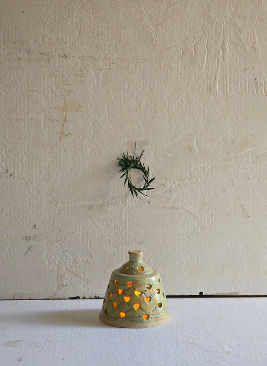 Handcrafted Winter-Green Glow Bell – Scribed Festive Stoneware Light Dome