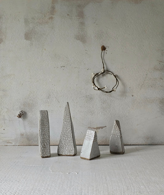 Set of Four Handcrafted White Glazed Christmas Trees – Juniper Impressions & Symbolic Cross Detail