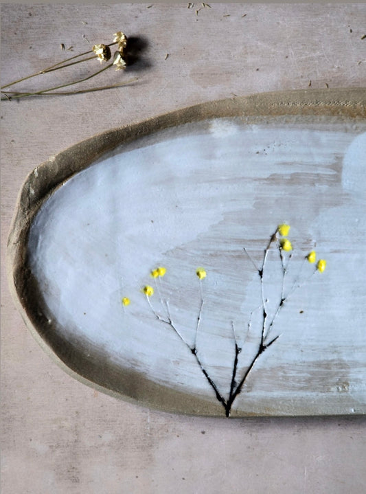 Handpainted Cootamundra Tree Serving Tray β Organic Ceramic with White Glaze & Exposed Stone Grey Edge β Artisan Tableware