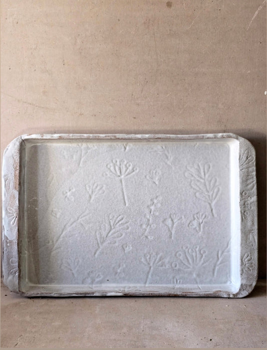One-of-a-Kind Handmade Rectangular Serving Dish β Matte White Glaze with Botanical Imprints & Side Handles (Imperfect, Discounted)