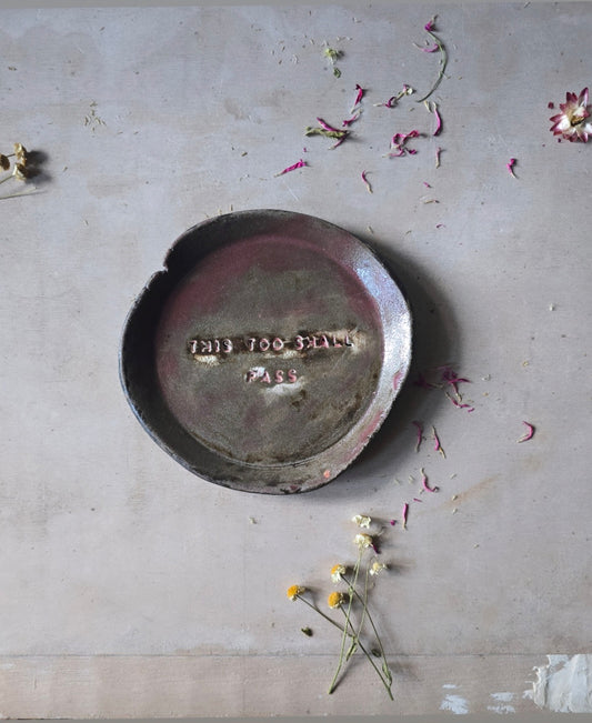 Handmade Round Trinket Dish β βThis Too Shall Passβ in Raspberry Grey Glaze (Imperfect, Discounted)