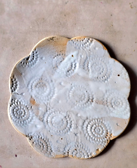 Handmade Flower-Shaped Ceramic Plates β Floral Imprint, Buff Clay, Grey & White Glaze β 18.5cm