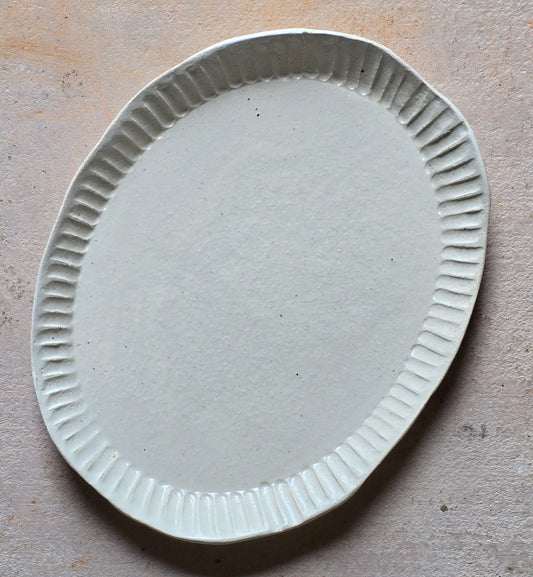 Handcrafted Oval Stoneware Dish – White Glazed Ceramic Serving Plate with Scribed Detail – Minimalist Rustic Home Decor