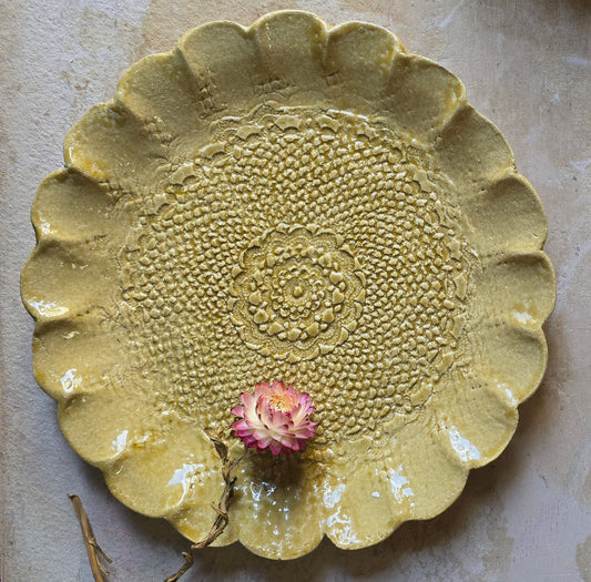 Handcrafted Flower-Shaped Ceramic Serving Dish – Yellow Ochre with Pressed Intricate Design – Rustic Pottery for Cake, Special Occasions & Gifting
