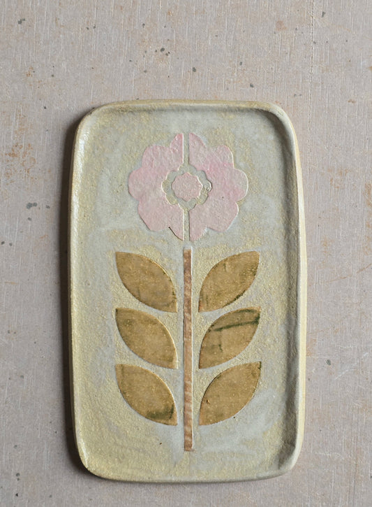 Handpainted Folk Art Flower Dish | Stony Beige Glaze with Pink Petals & Olive Green Leaves