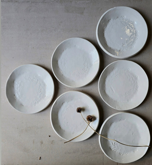 Handmade Organic Dinner Plates – Milky White Glaze with Leaf Wreath Imprint & Raw Clay Detail, 23cm