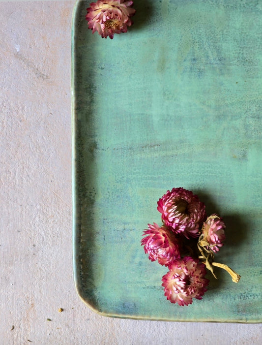 Handmade Ceramic Serving Tray – Rectangular with Rounded Edges, Raw Silk - Like Glaze in Green & Blue