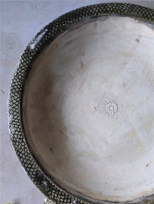 Handcrafted Ceramic Serving Dish – Dark Olive & Latte Glaze with Embossed Flower | Unique Bespoke Pottery Plate