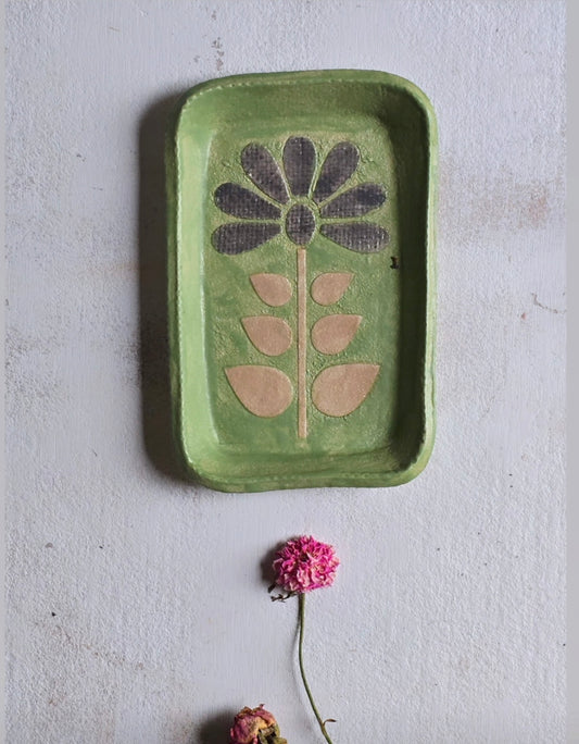Handpainted Folk Art Flower Dish | Apple Green Textured Ceramic Snack Plate