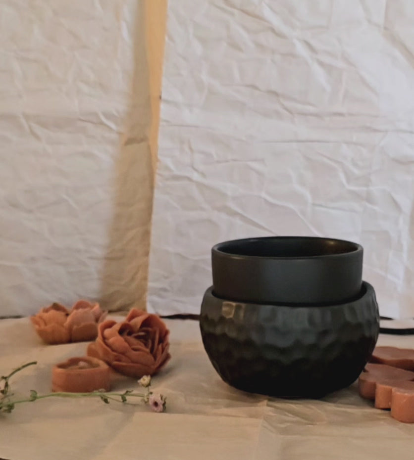 Enhance your space with our elegantly designed matte black ceramic wax warmer. Featuring a stylish dimpled pattern, this minimalist piece seamlessly complements any décor while providing a flameless, hassle-free way to enjoy your favorite wax melts. This warmer utilises a high quality heat pad for warming wax melts without the need for globes.