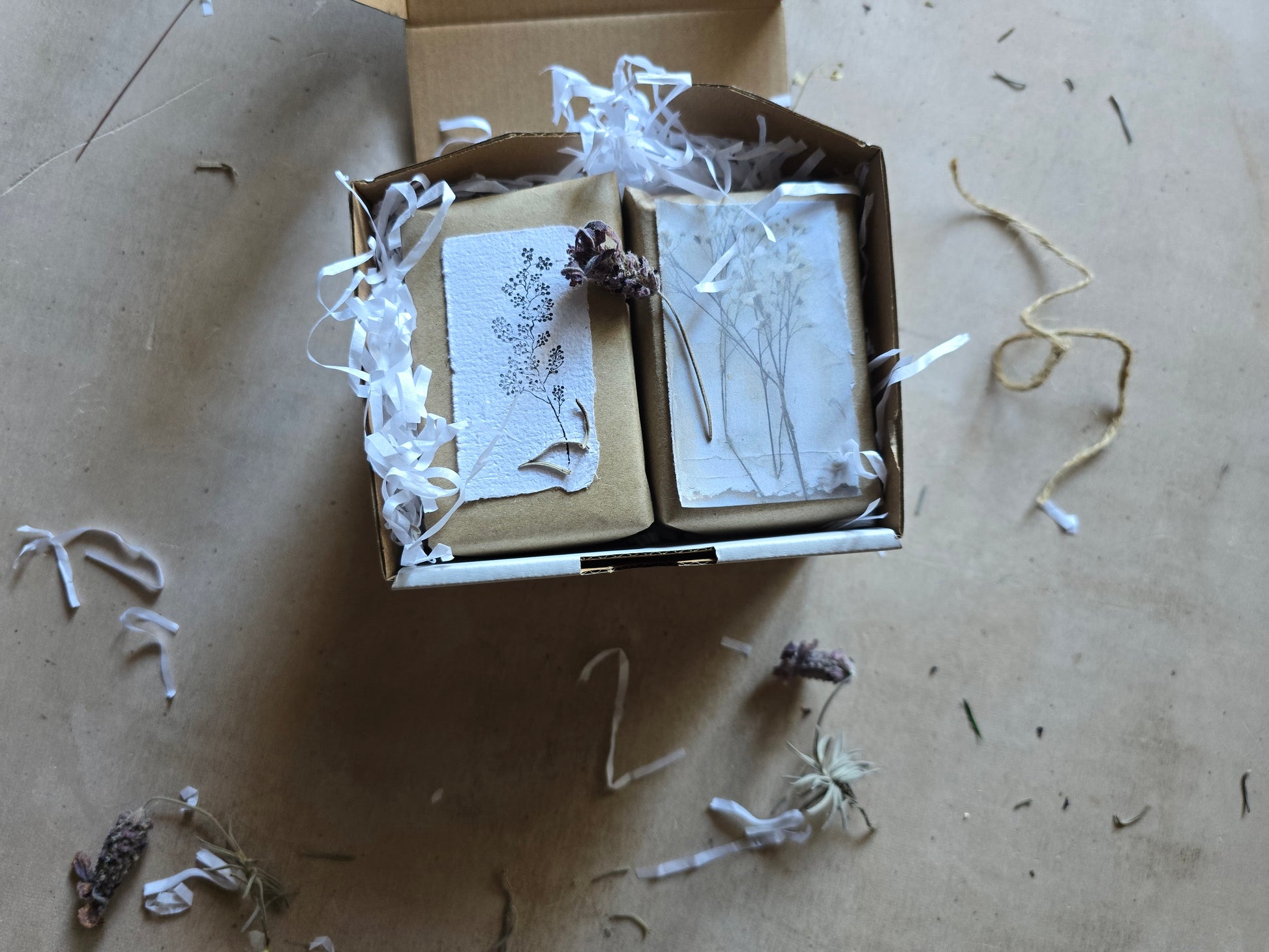The soaps are presented in a sturdy kraft gift box, wrapped with rustic paper and tied with a soft, frayed cotton ribbon, finished with dried lavender for a gentle, natural flourish.