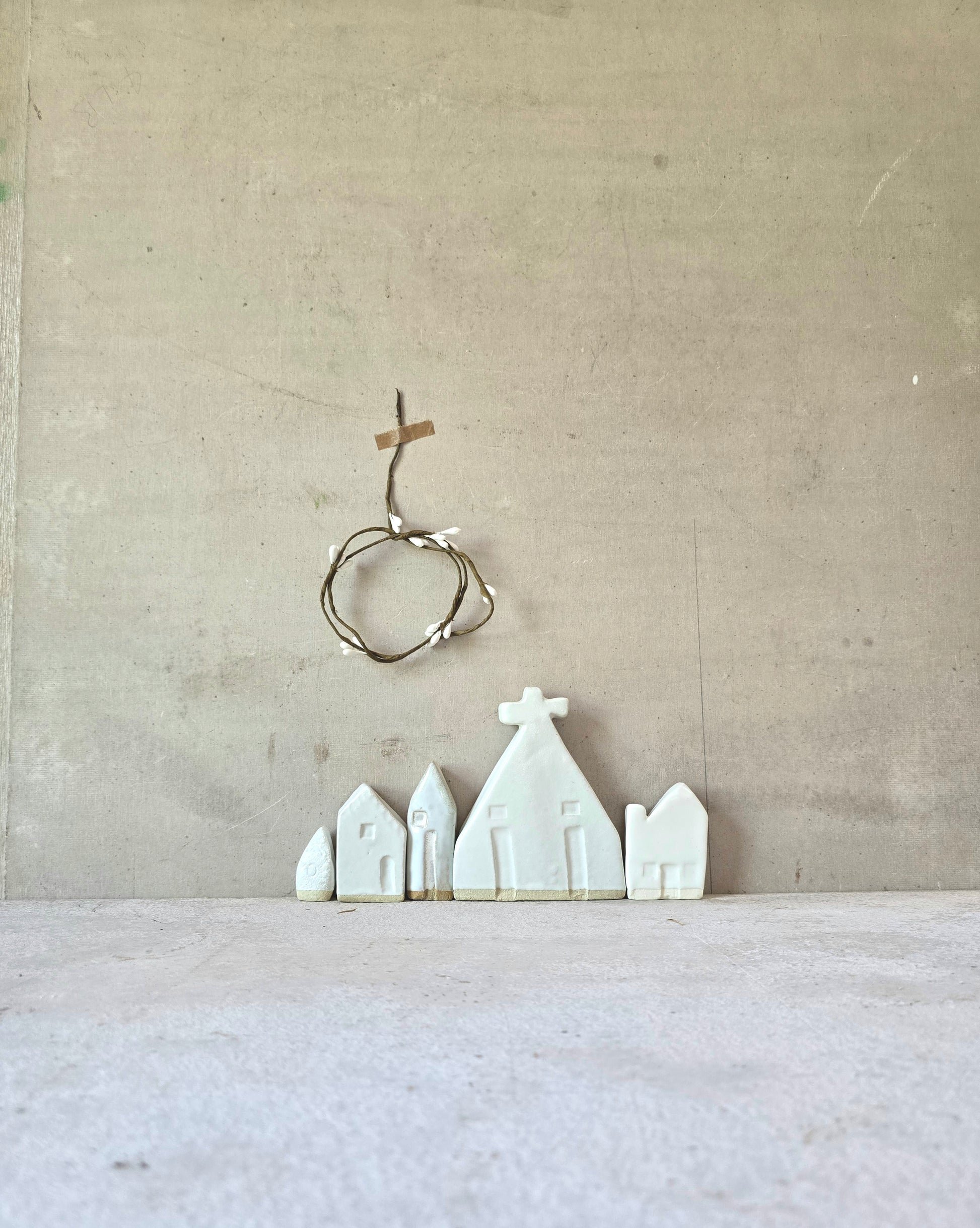 A humble gathering of five houses, each one slightly different in form and character. A gentle nod to the simplicity of village life, along with a metal hanging star ornament.