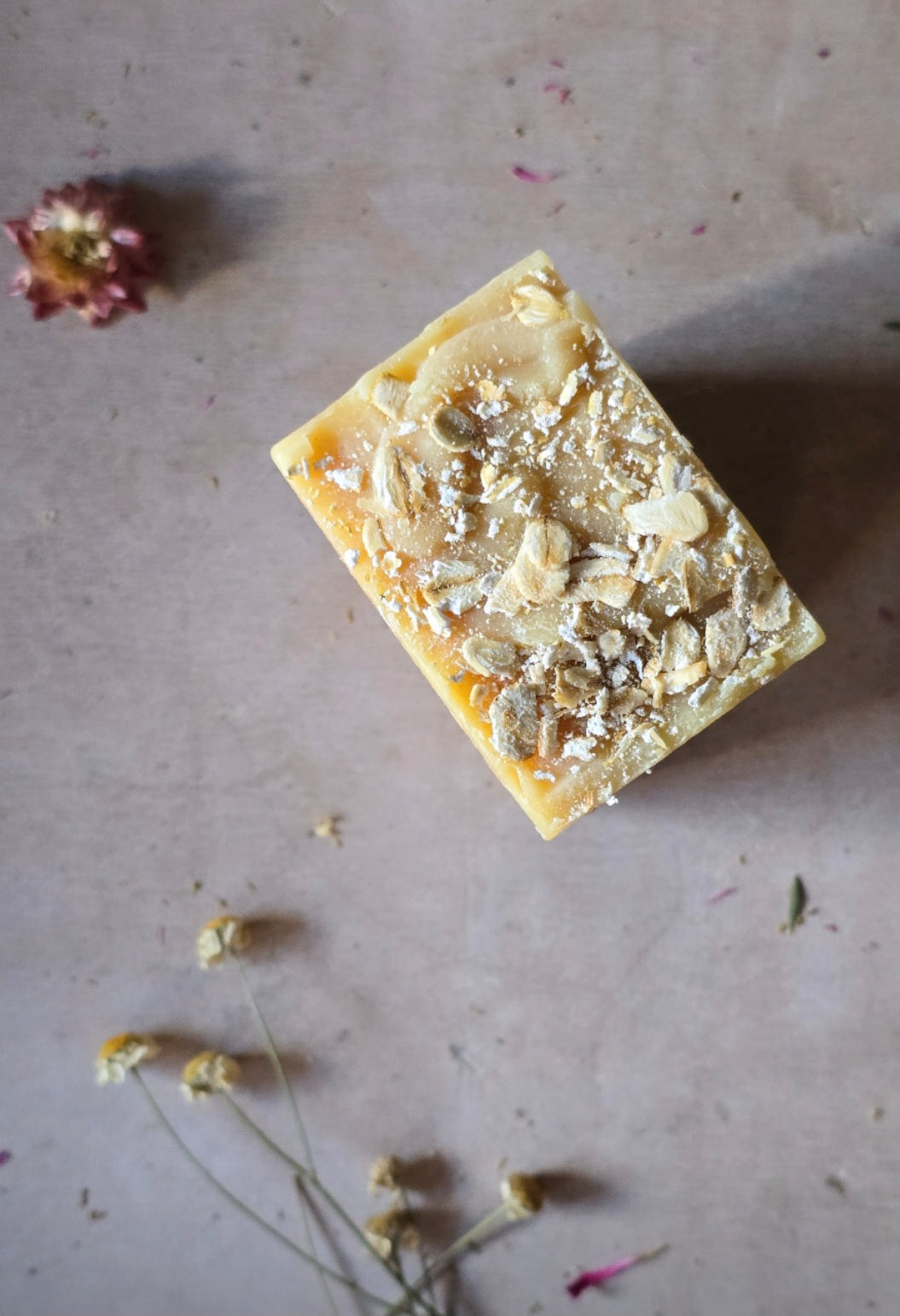 Each chunky bar weighs a minimum of 170g-200g and is topped with decorative colloidal oatmeal for gentle exfoliation and visual appeal. The rich, creamy lather gently cleanses while nourishing your skin, thanks to a luxurious blend of olive oil, coconut oil, shea butter, cocoa butter, sunflower oil, and castor oil.