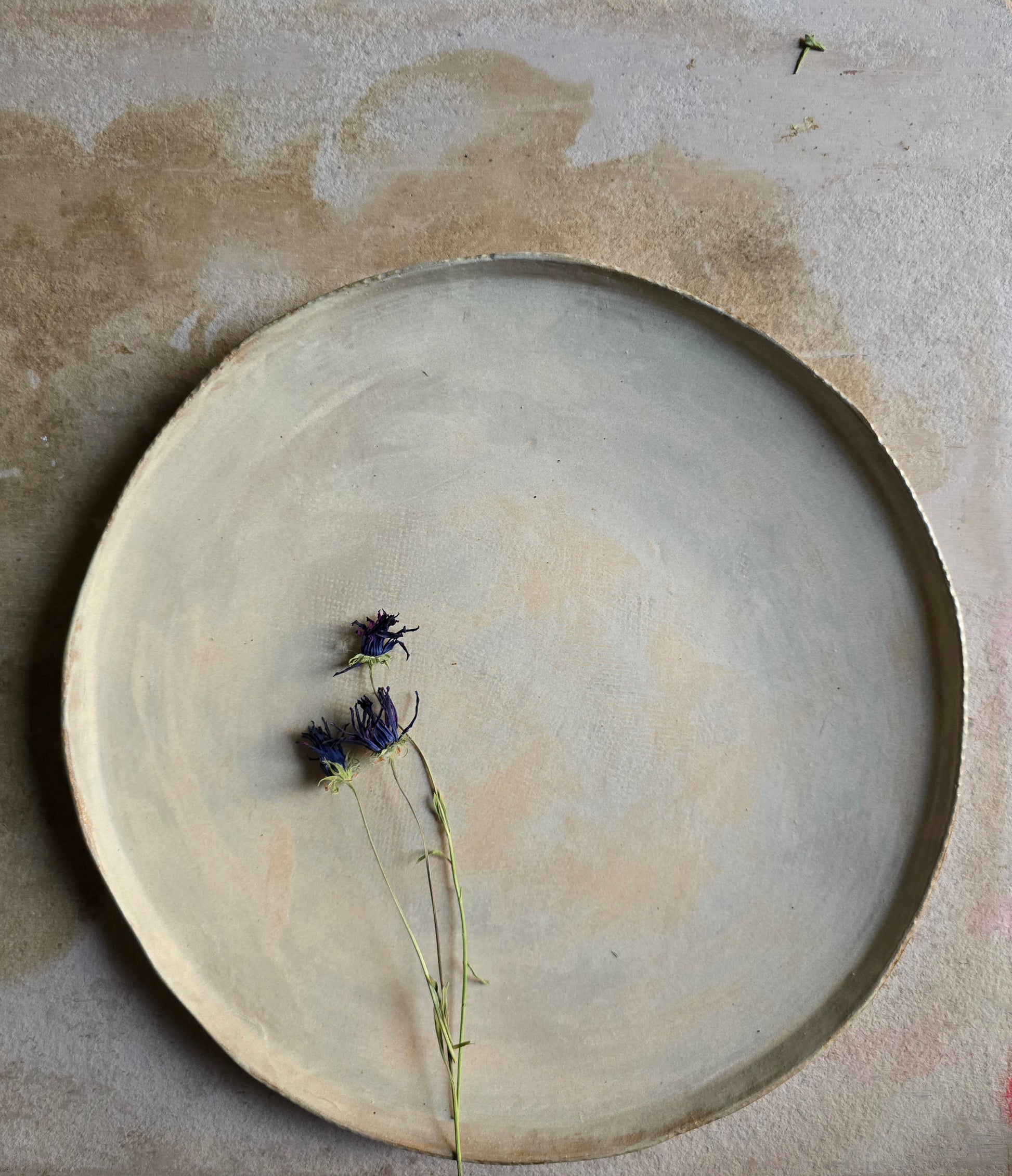 A generously sized handcrafted round ceramic platter in a warm, earthy matte beige, accented with a subtle apricot glaze breaking through at the center. Its gently raised, narrow lip and angled profile make it easy to lift while adding an elegant, minimalist touch.