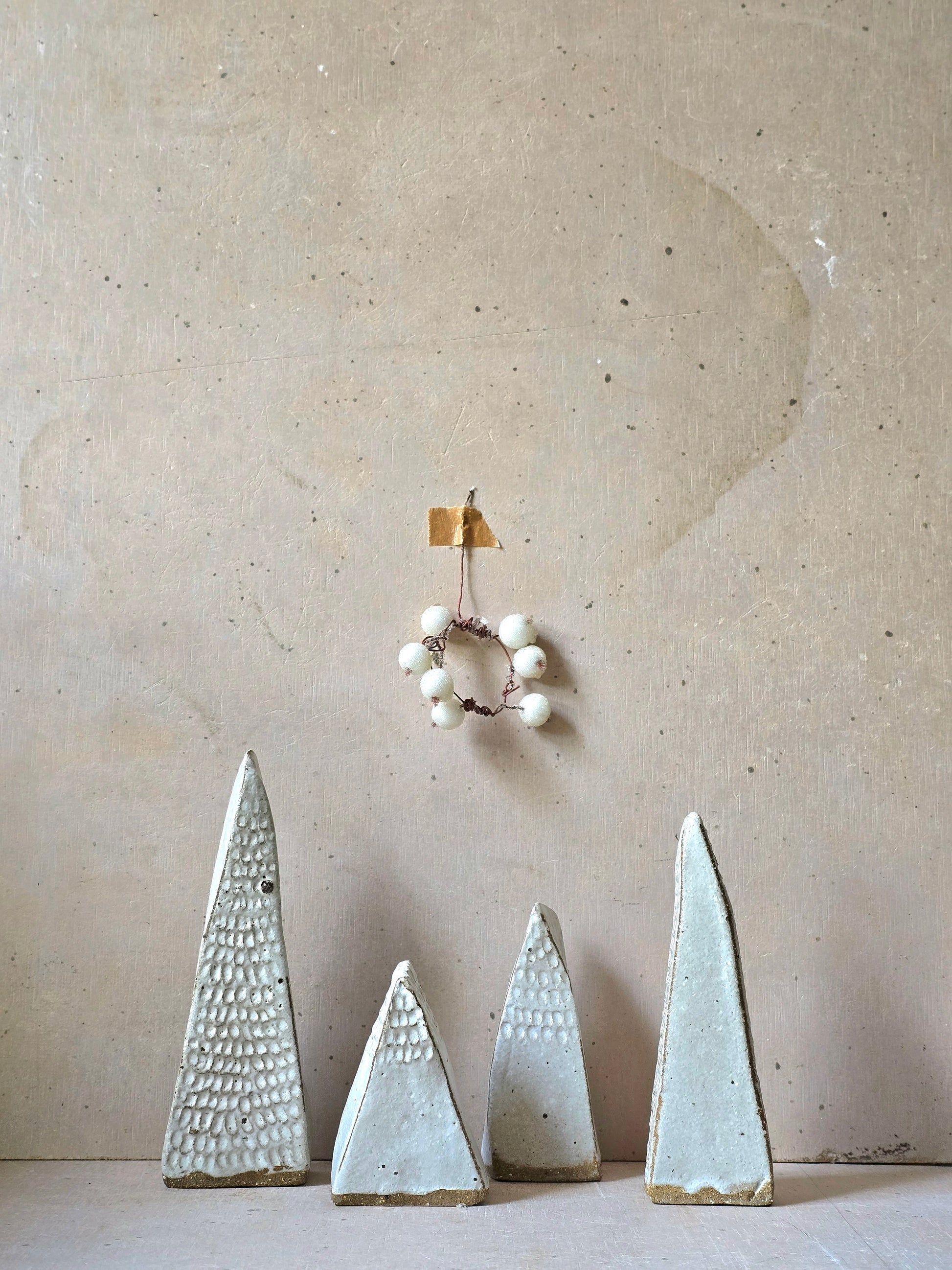Handcrafted Rustic Ceramic Christmas Tree Decorations – Set of 4 in Dove Grey White Glaze