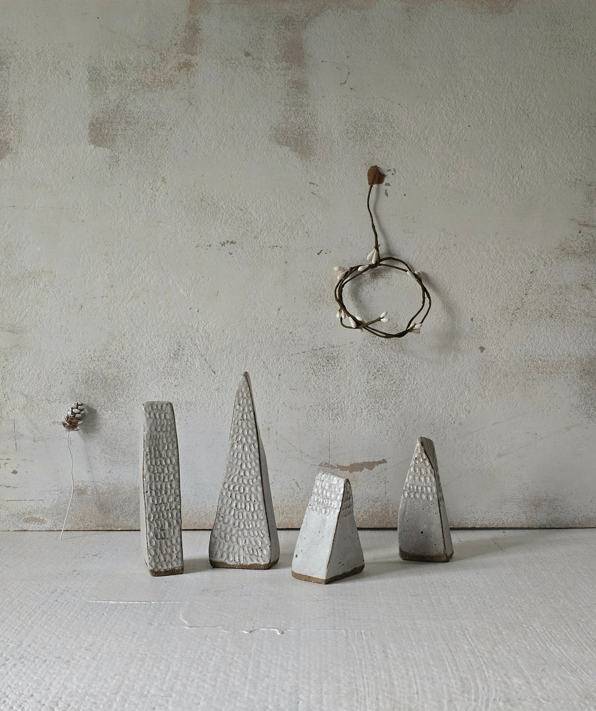 A set of four handcrafted ceramic Christmas tree decorations made from dark biscuit clay and finished with a soft dove grey-white glaze. Each piece features a textured pattern impressed into the clay, inspired by tiled rooftops, giving them a tactile, rustic character.
