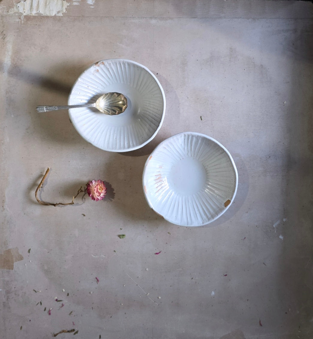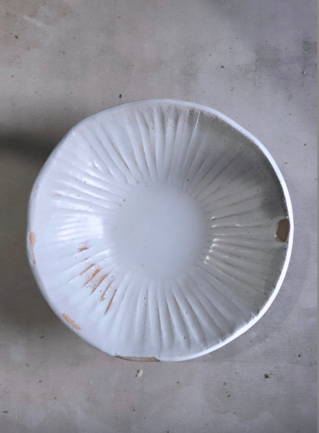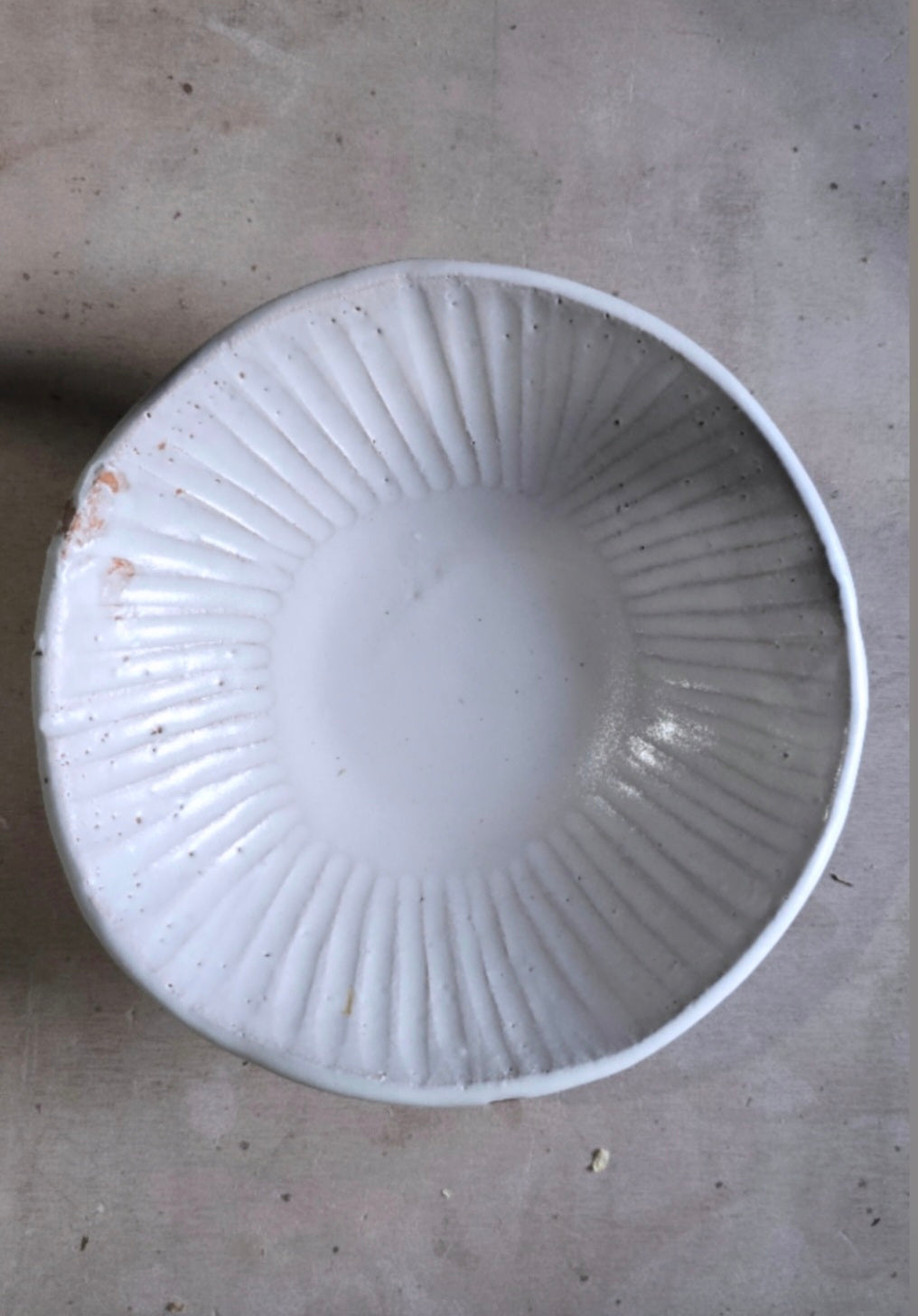 These handmade ceramic bowls are the perfect blend of everyday functionality and artisan charm. Each bowl features a scribed design on the inside, adding subtle texture and visual interest. Glazed in a white satin finish that softly transitions to light grey, the glaze reacts beautifully with the warm biscuit-toned clay body, giving each piece a unique, organic character.