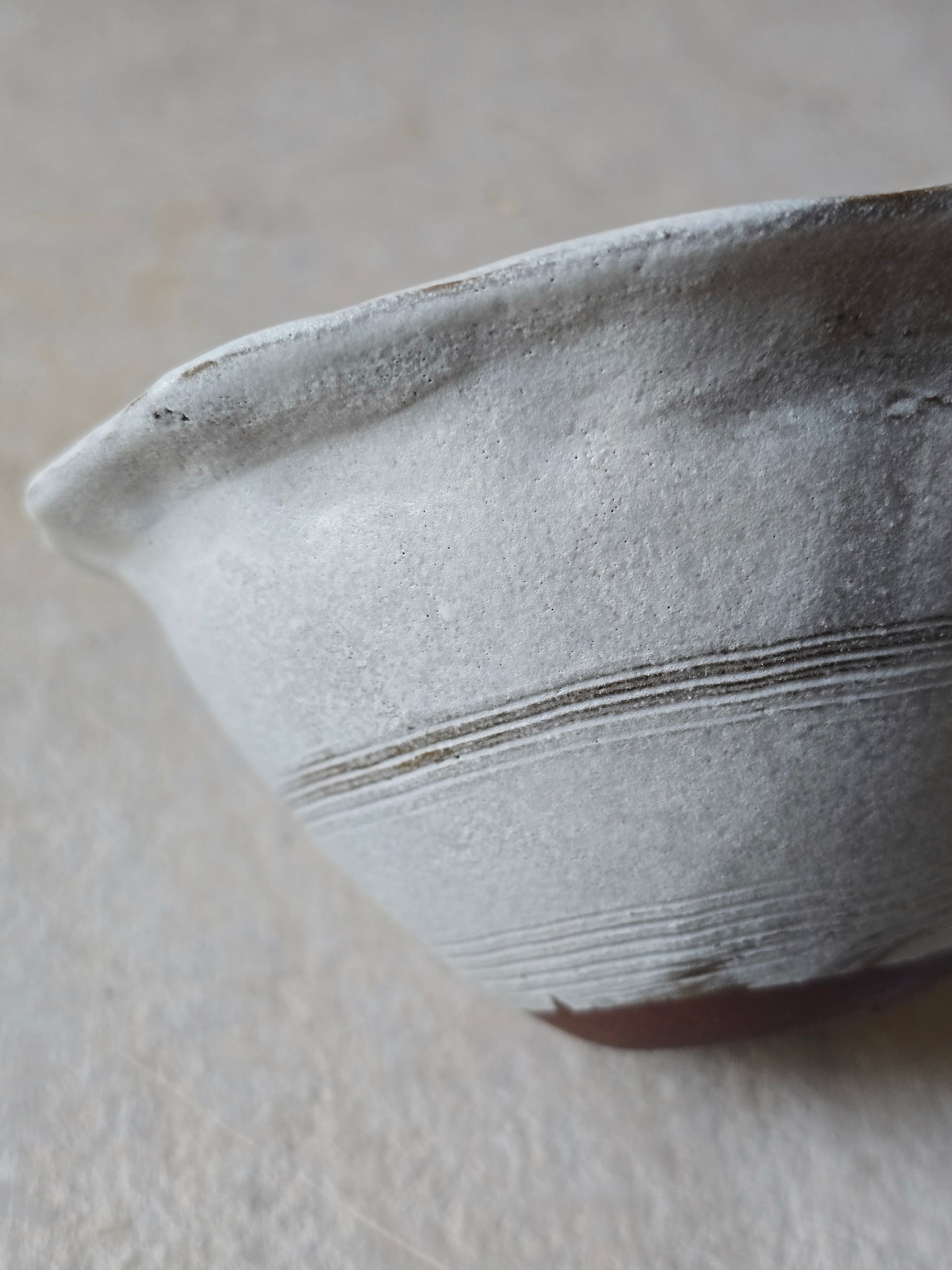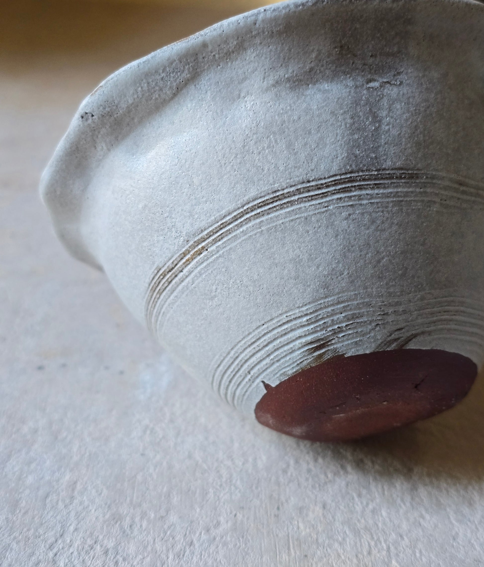 This handmade ceramic bowl is crafted from rich mahogany clay and finished with a smooth matte white glaze that gently shifts to soft grey where the clay body shows through. Its organic conical shape and hand-scribed exterior design add a rustic, artisanal charm to any setting.