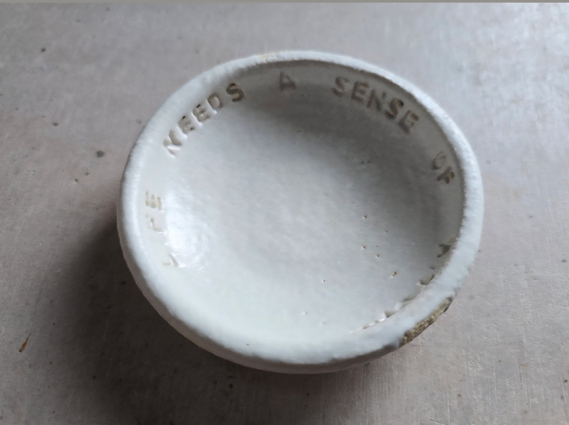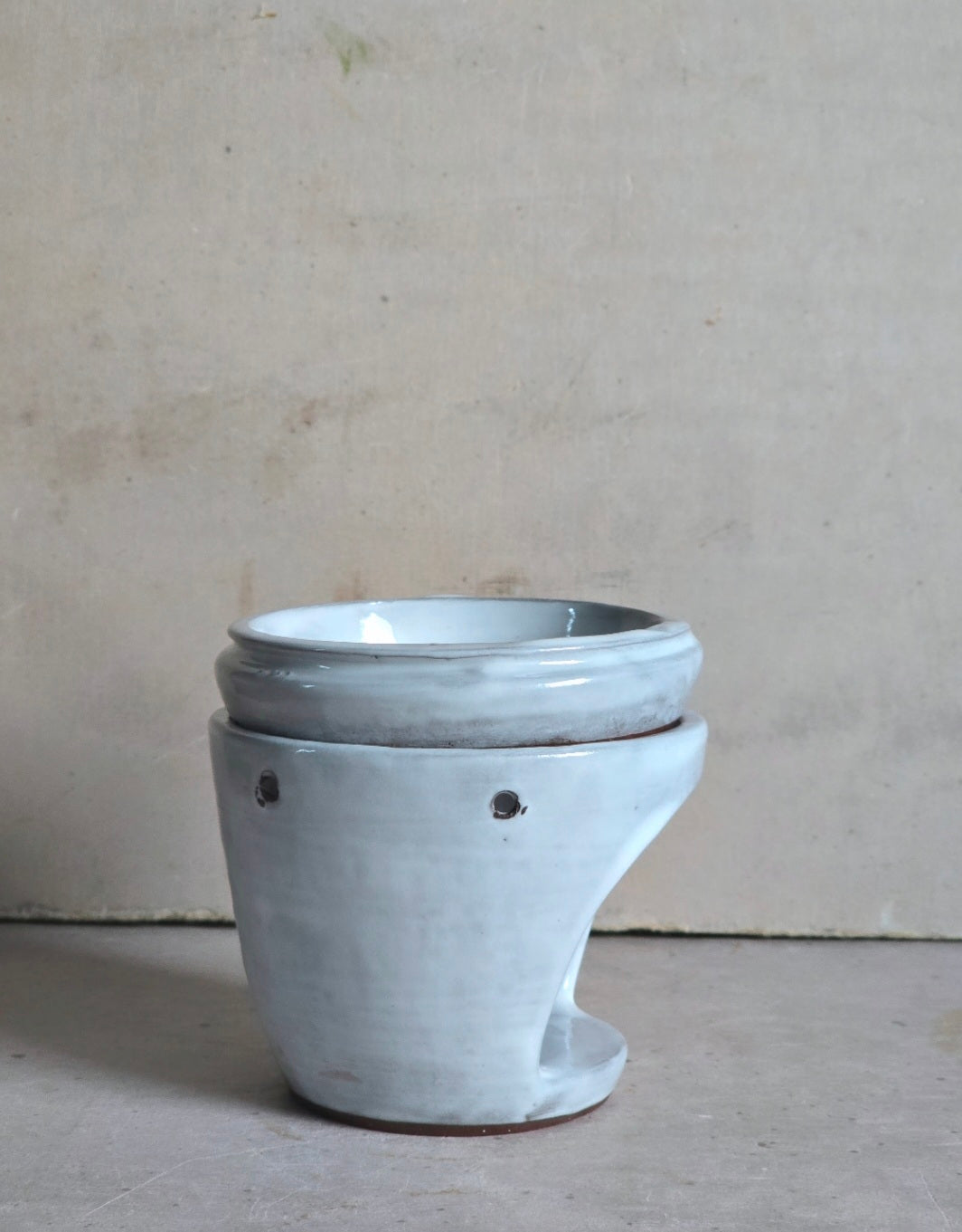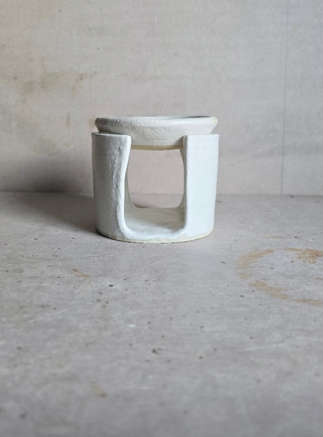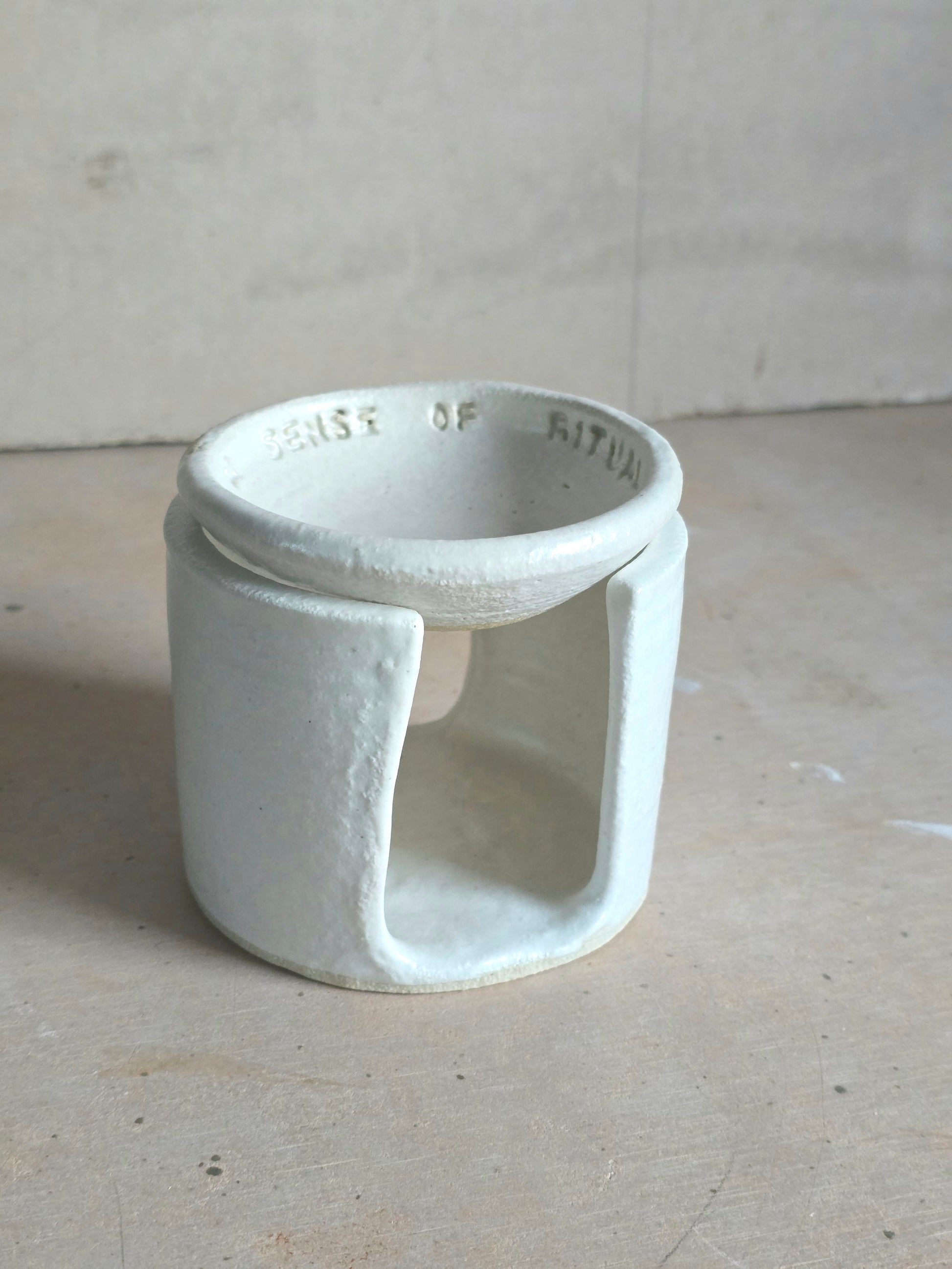 Finished in a soft matte white glaze, allowing the natural flecks of the clay to show through. Features two ventilation openings for optimal airflow. The phrase "Life Needs a Sense of Ritual" is subtly stamped beneath the rim of the top bowl.