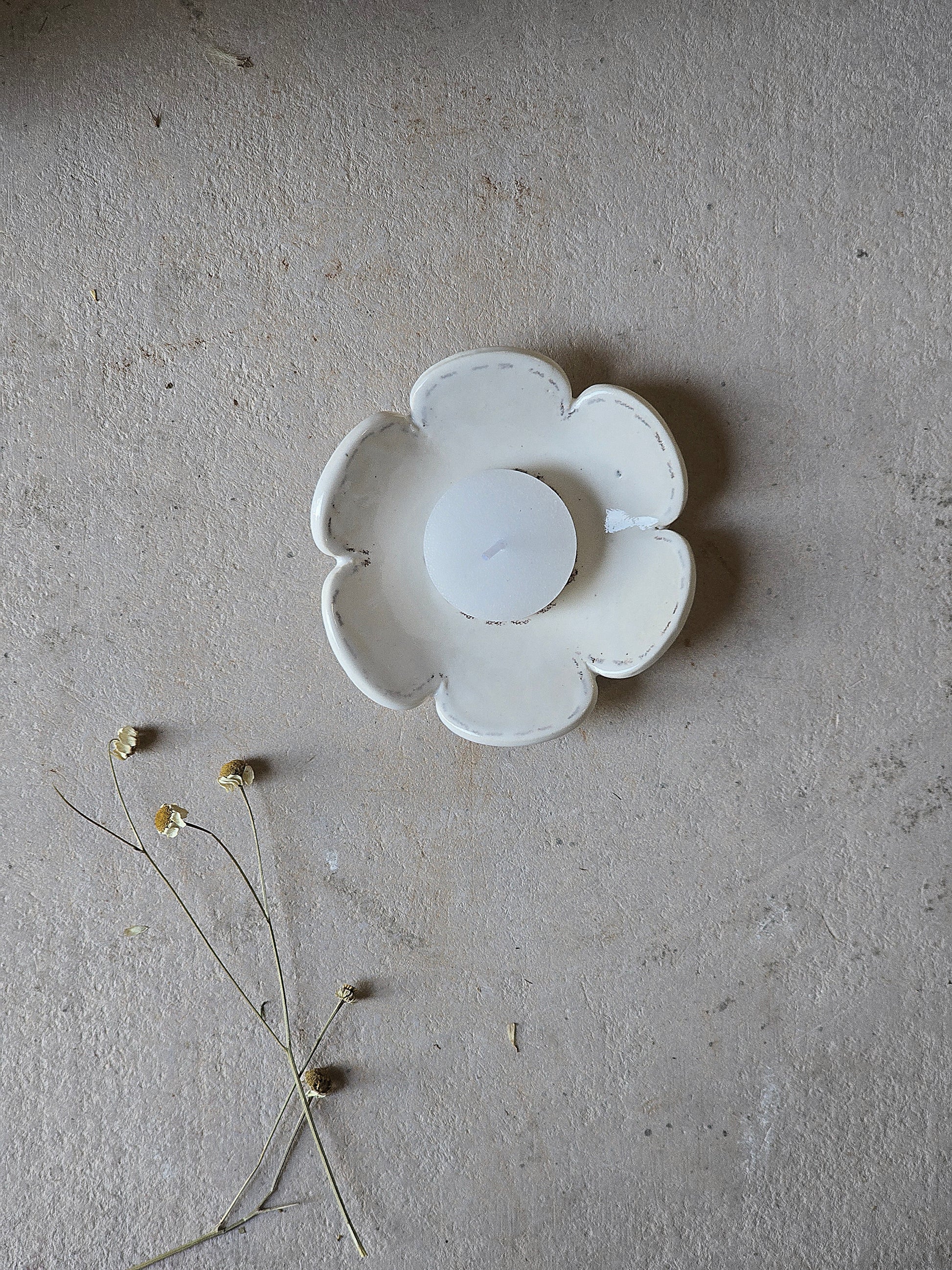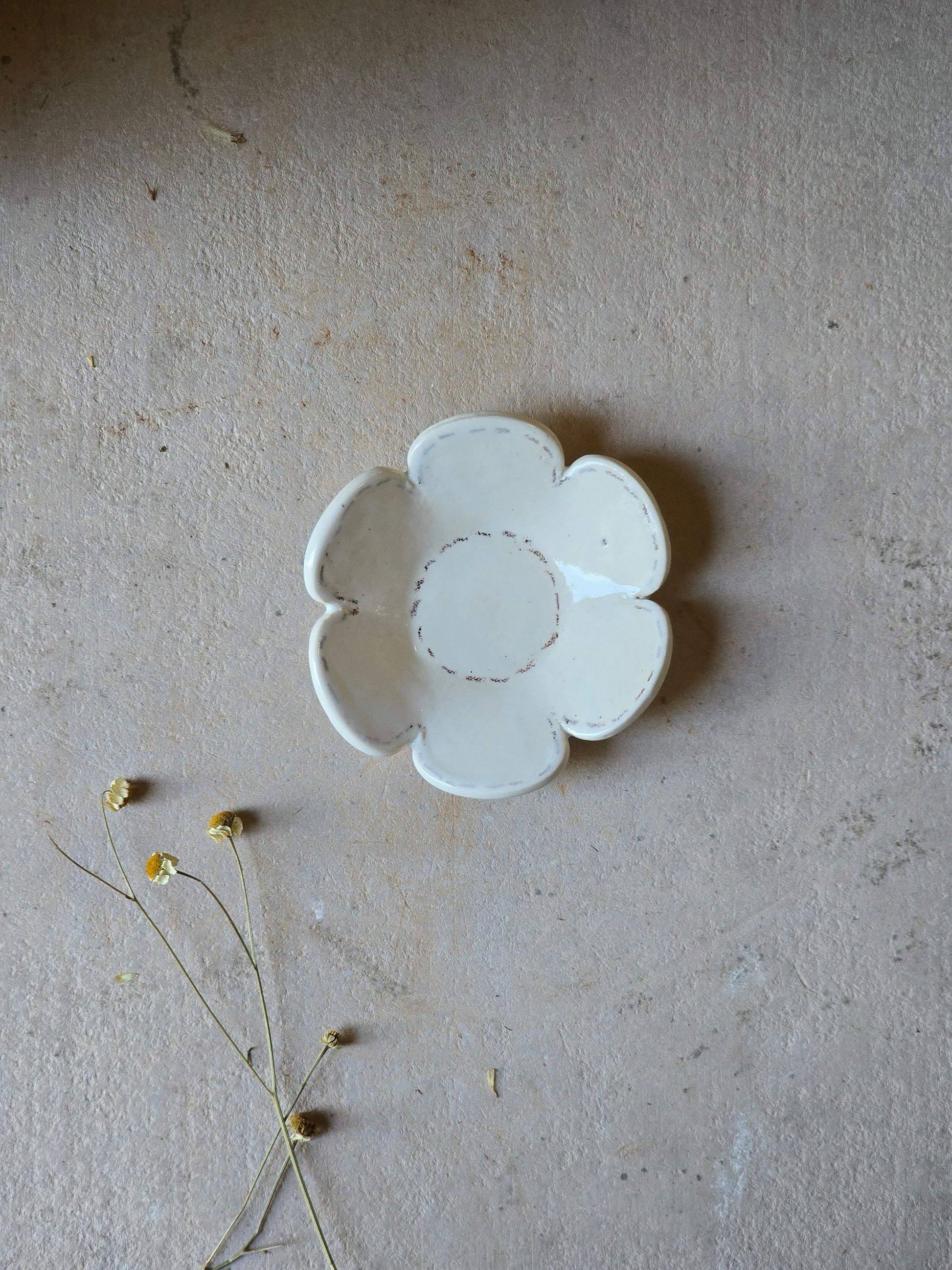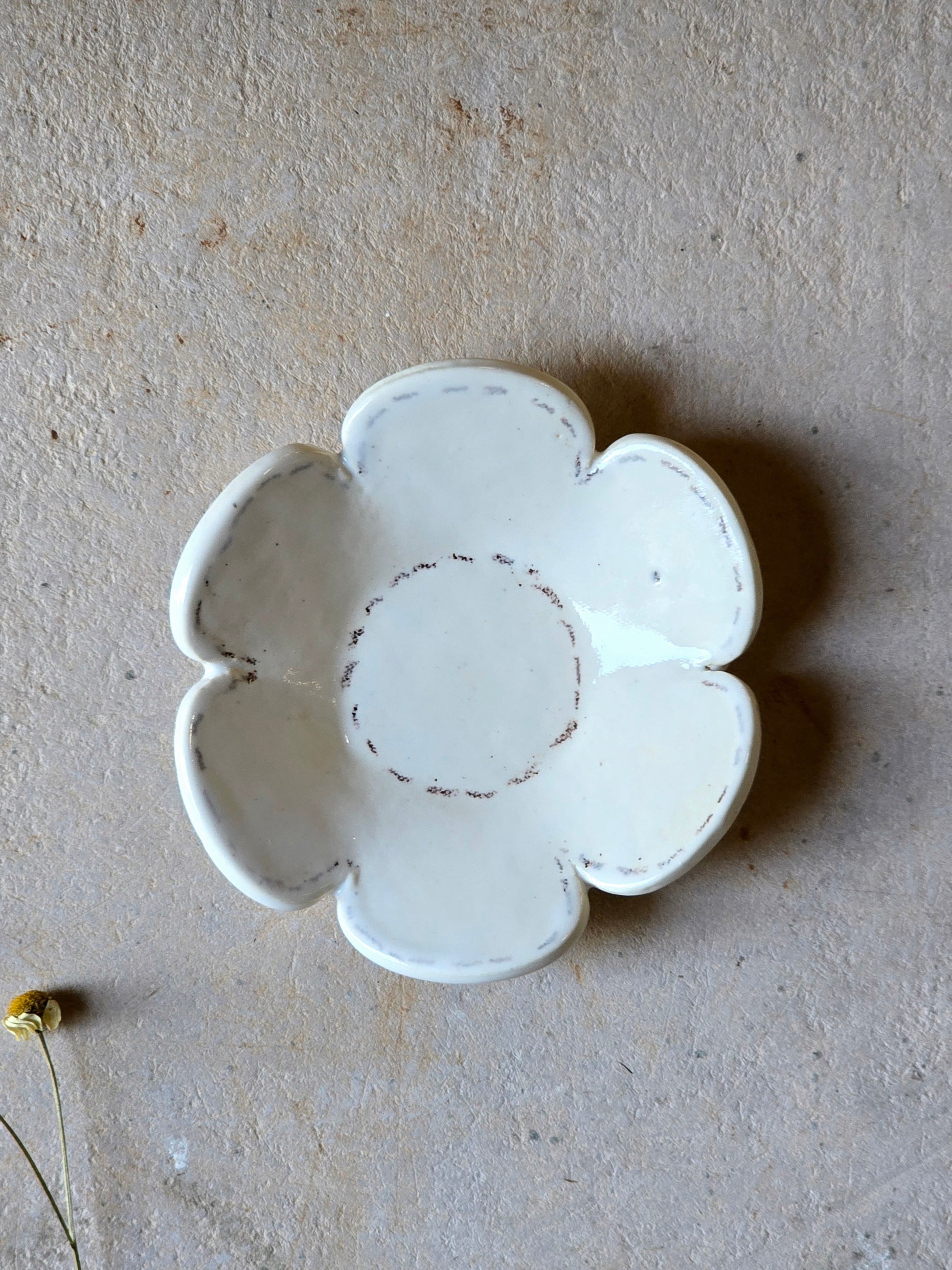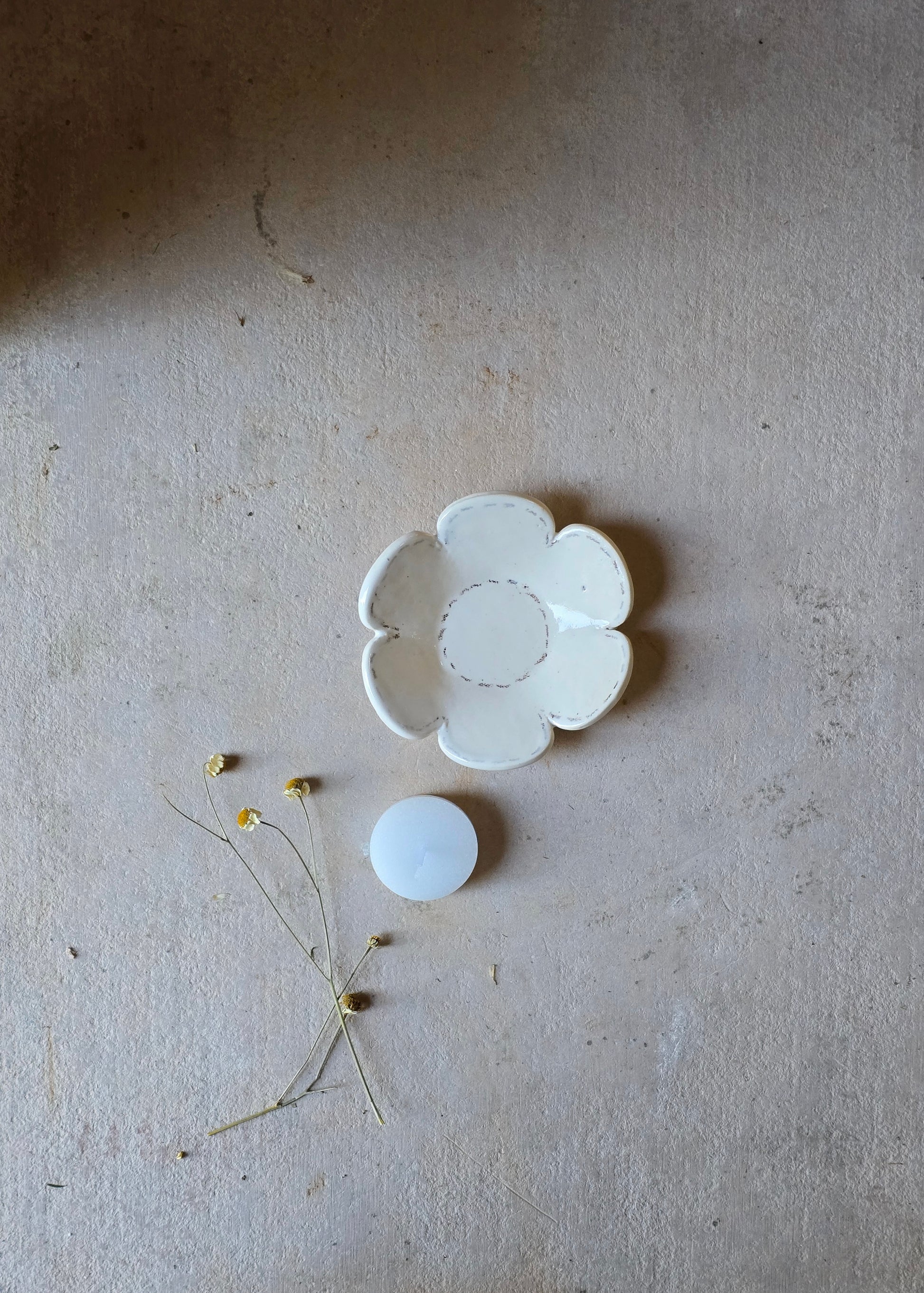 Elevate your space with this handmade milky white flower dish, crafted with simple elegance and distinctive charm. Featuring chalky brown stitching, this ceramic dish is perfect for holding a tealight, small jewellery, or everyday bits and bobs. Its unique design adds a touch of rustic artistry to any setting. Approximate dimensions: diameter 9.5cm, height 2cm.
