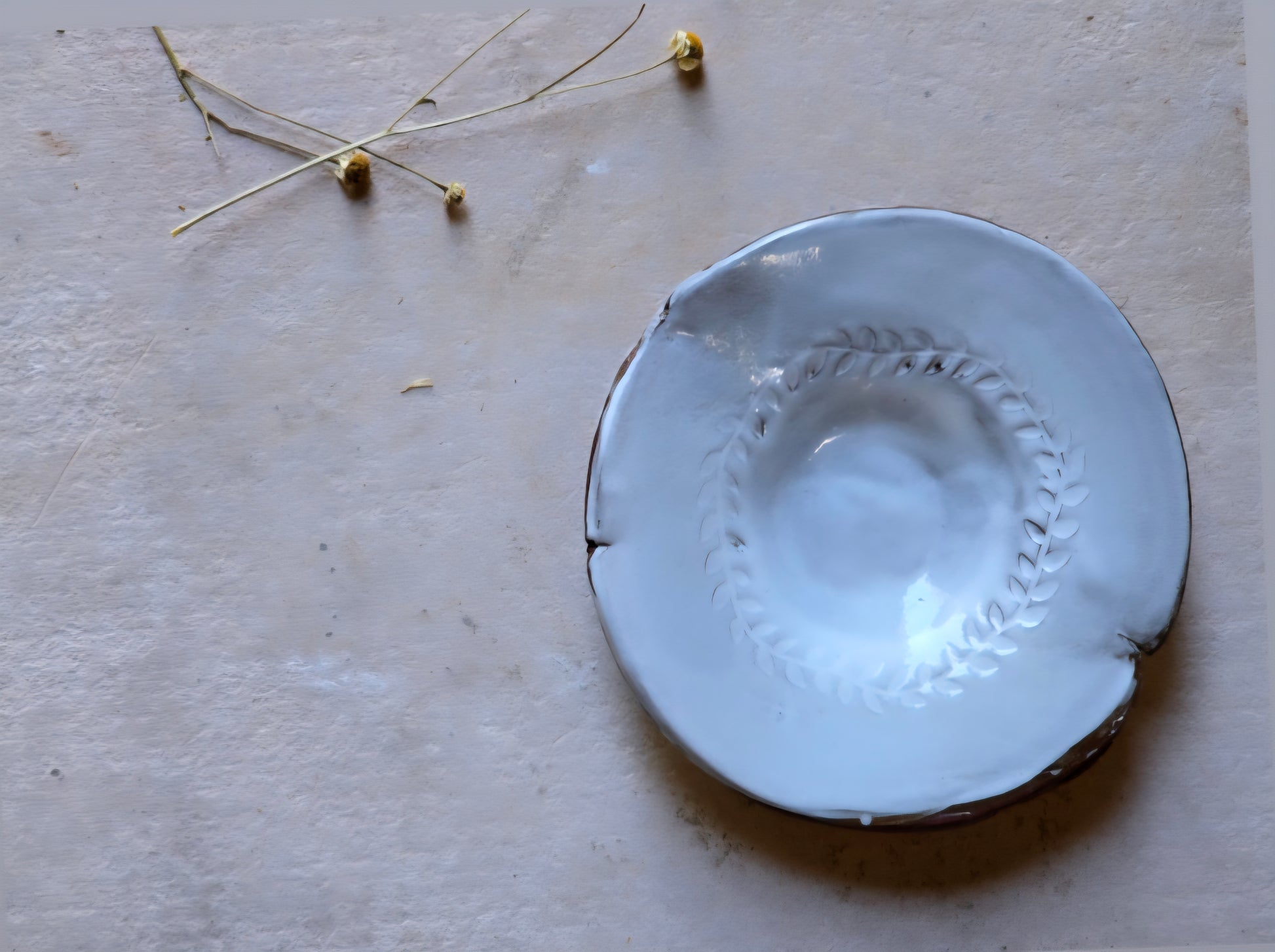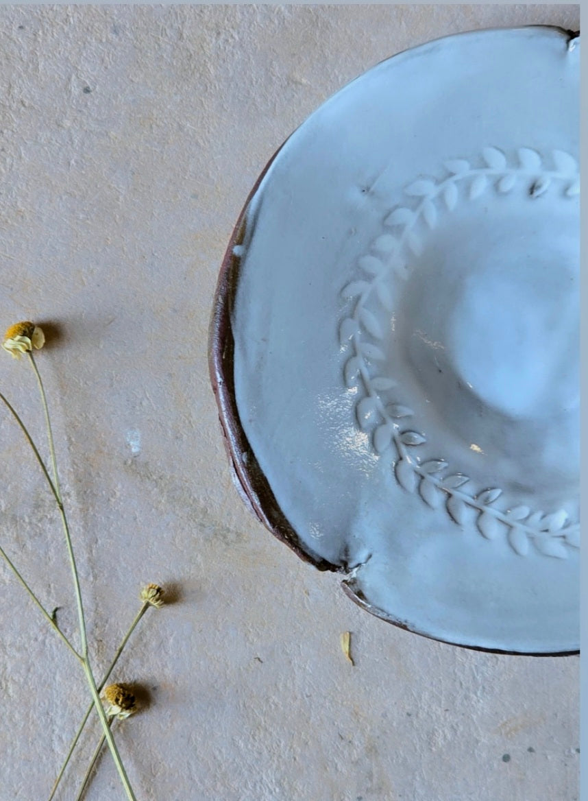 Handmade Organic Round Dish – Mahogany Clay with White Sheer Glaze & Leaf Wreath Imprint | 13cm Tealight or Trinket Holder