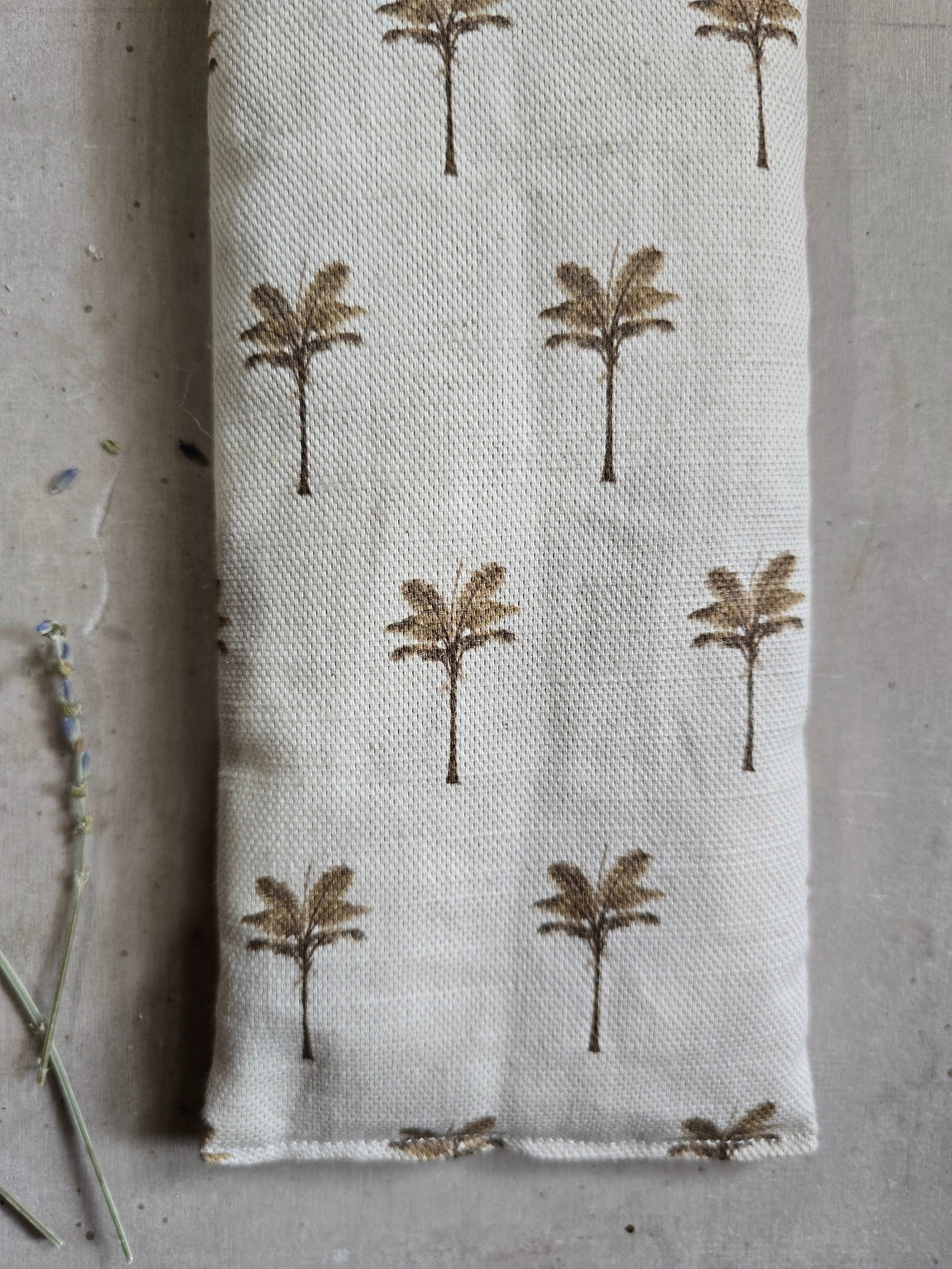 Each pillow is filled with 100% Australian-grown lavender and wheat, offering a gentle, weighted pressure that encourages relaxation. The front features a neutral cream linen adorned with a soft brown palm-tree print, while the reverse is finished in a smooth, plain cotton for a comforting feel against the skin.