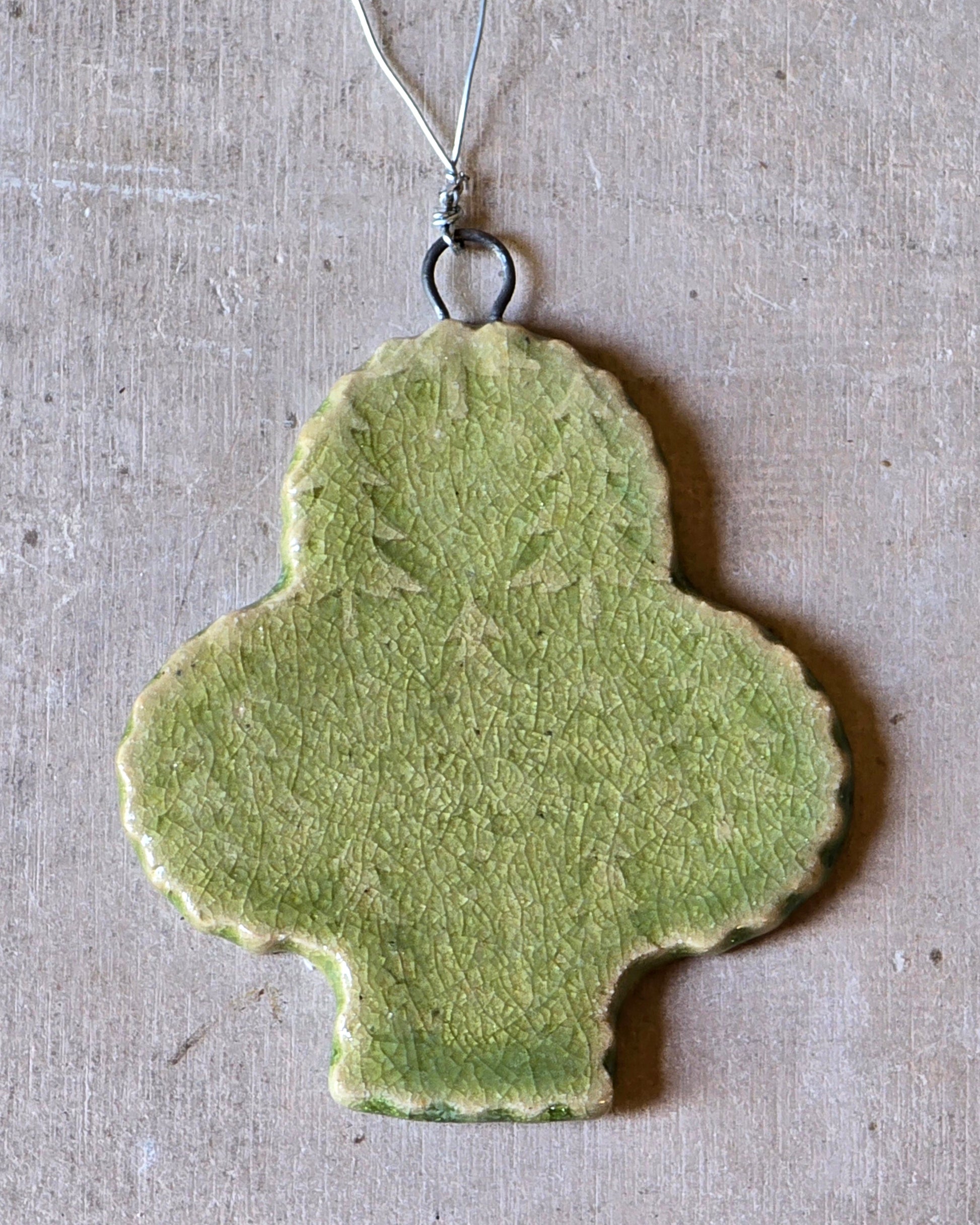 Light olive crackled-glazed Christmas tree decorations add a uniqueness to the festive season decor. Each ornaments is embossed with Christmas tree designs, featuring a beautiful crackled finish which enhances their handcrafted appeal. Complete with a wire hanger, they're perfect for decorationing your christmas tree or adding a more personal touch to gift wrapping presents. Both sides of these ornaments are glazed...