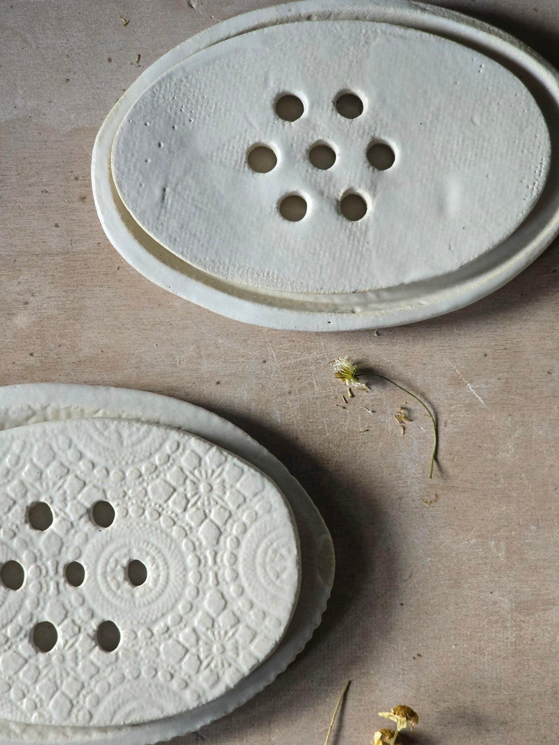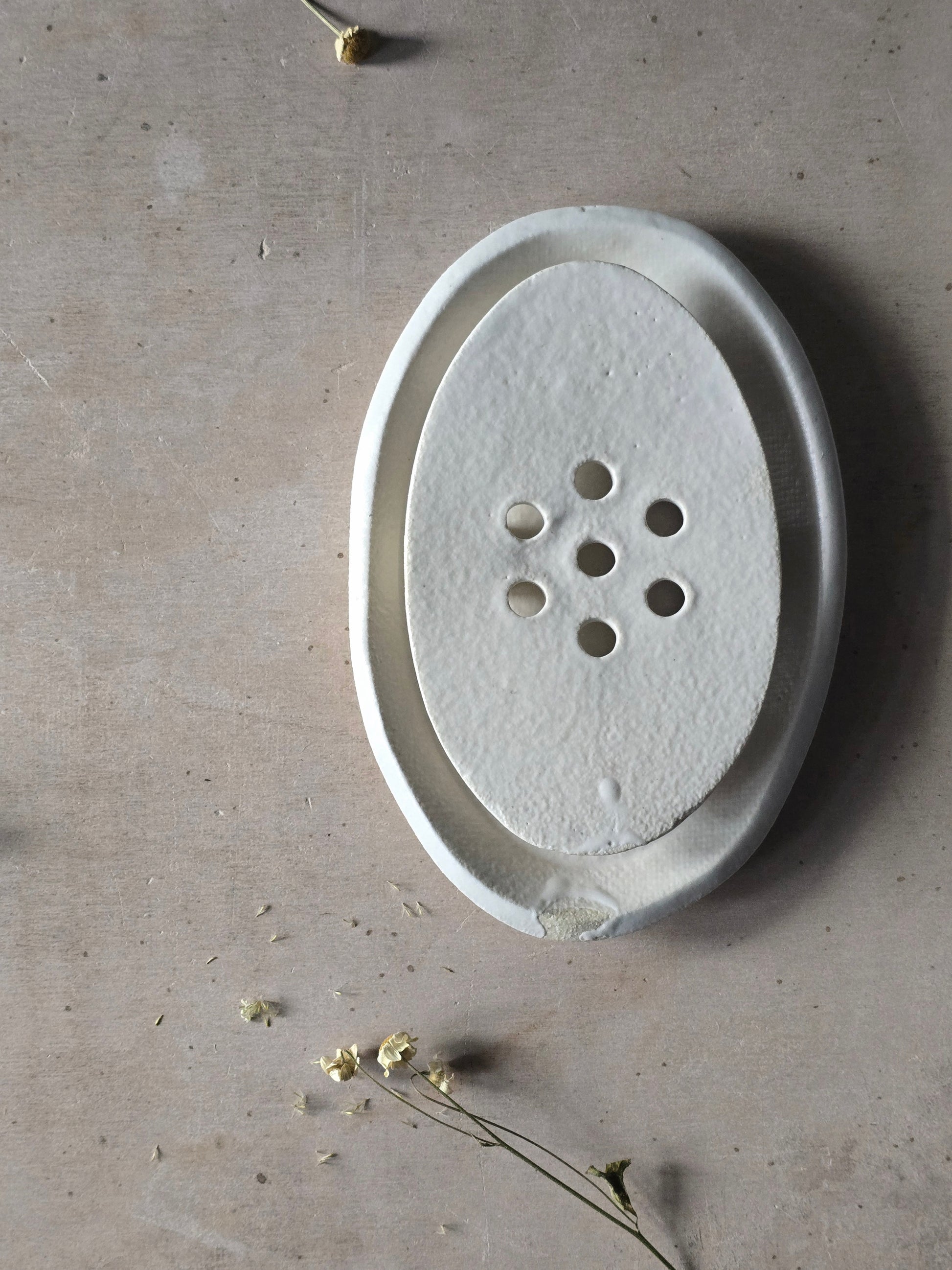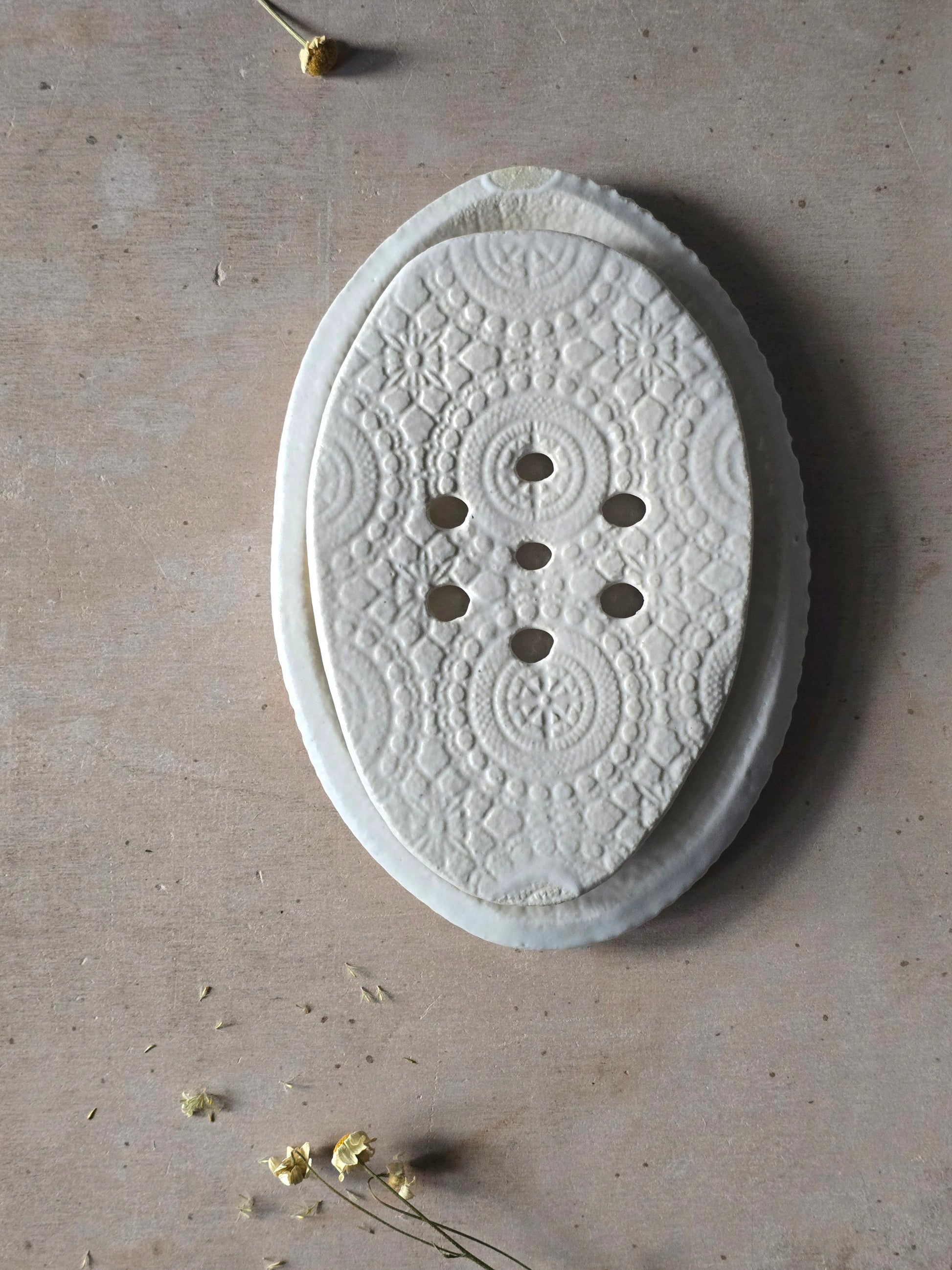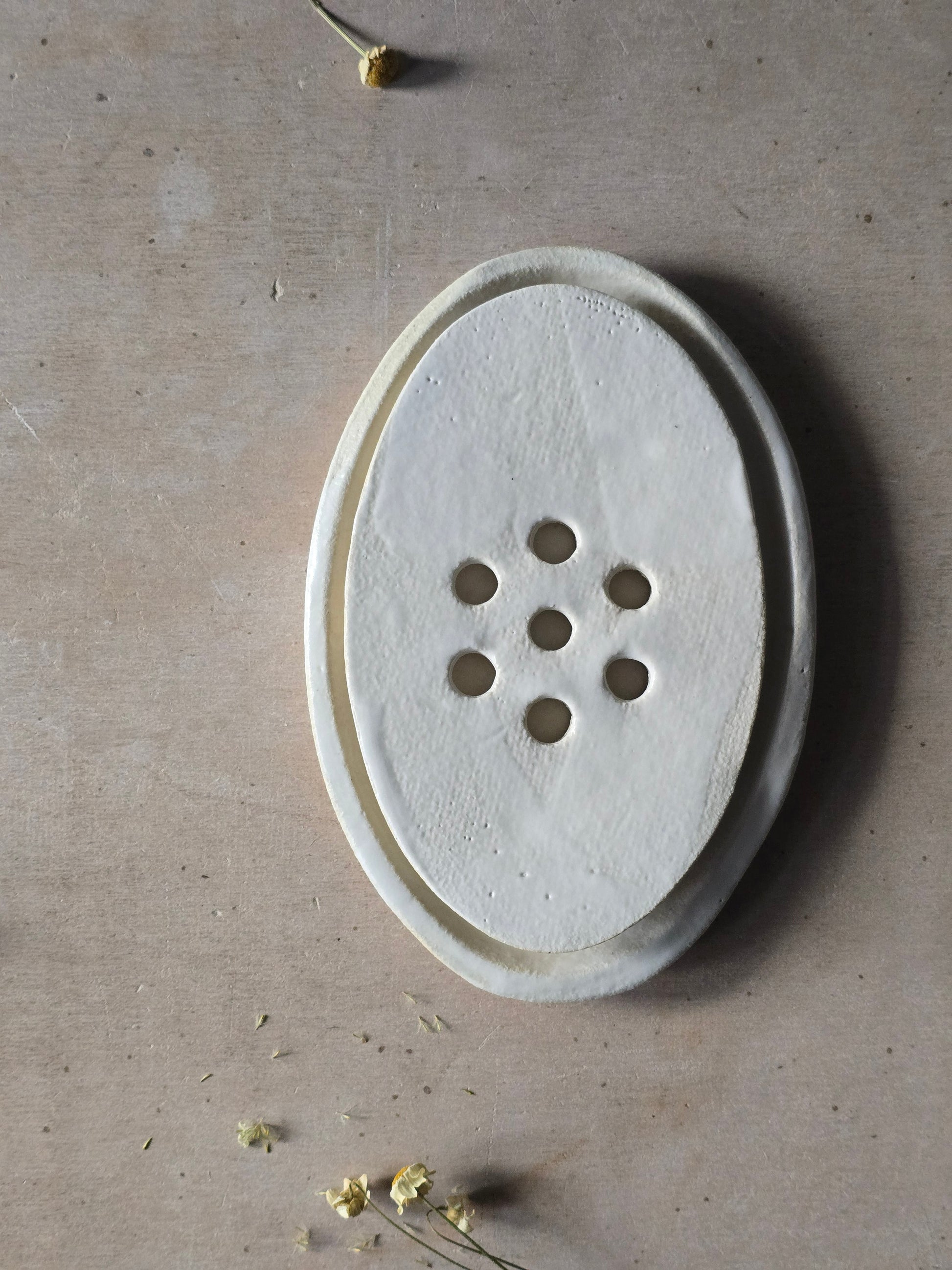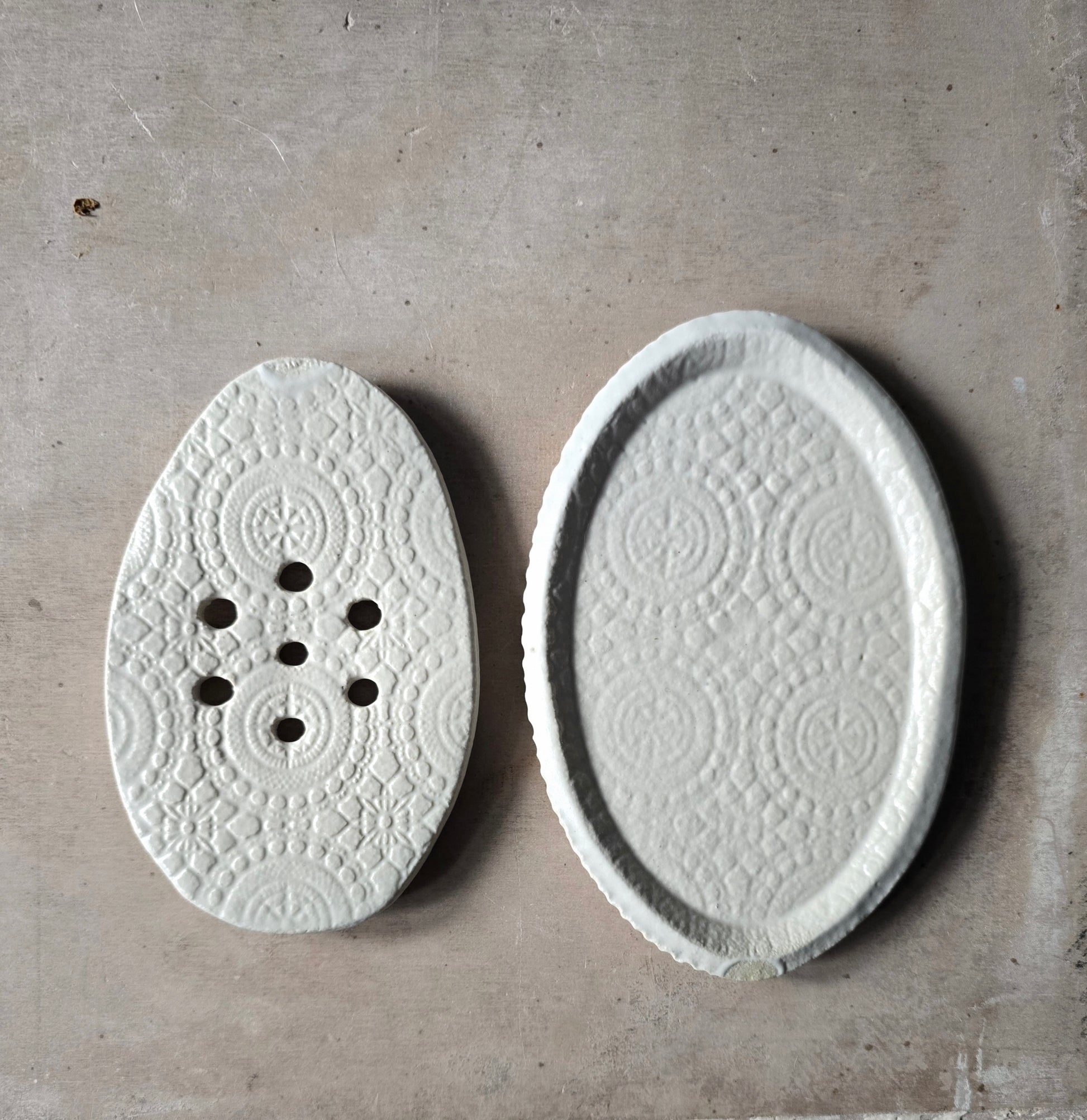 Handcrafted two-piece oval ceramic soap dish with drainage