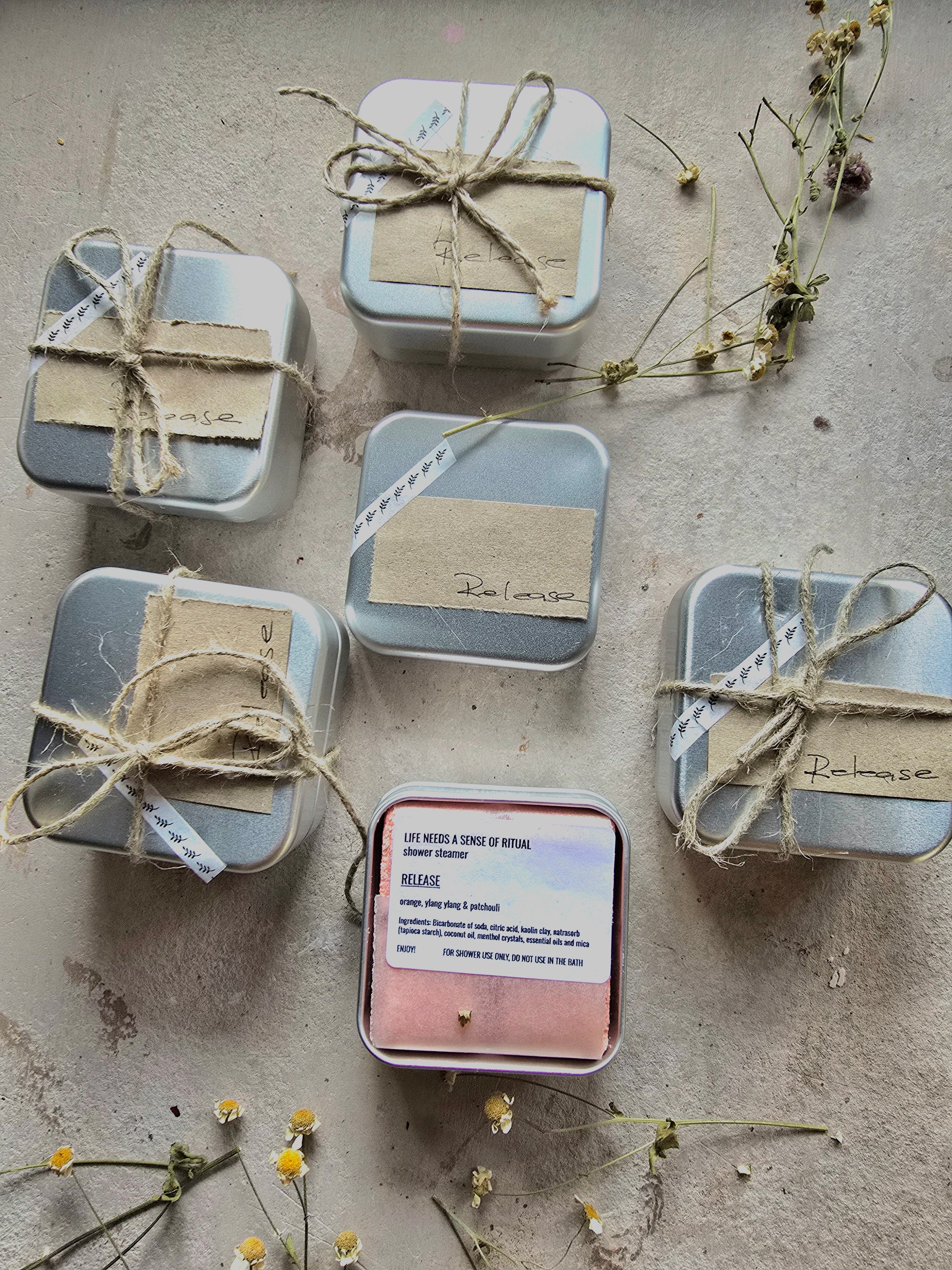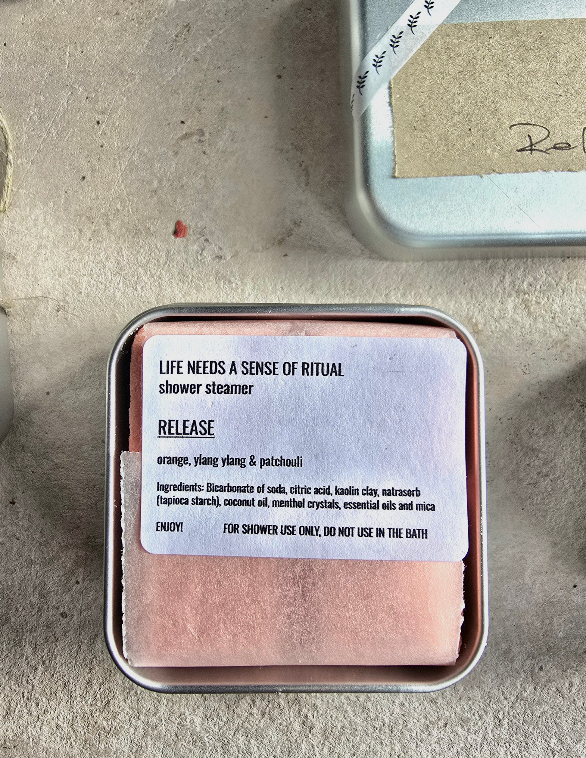 This RELEASE shower steamer clears the airways with invigorating menthol crystals, complemented by a subtle blend of orange, ylang ylang & patchouli essential oils, helping melt away tension. The gentle citrus notes of orange blend beautifully with the sweet earthiness of patchouli, creating a shower experience that feels indulgent and uplifting.