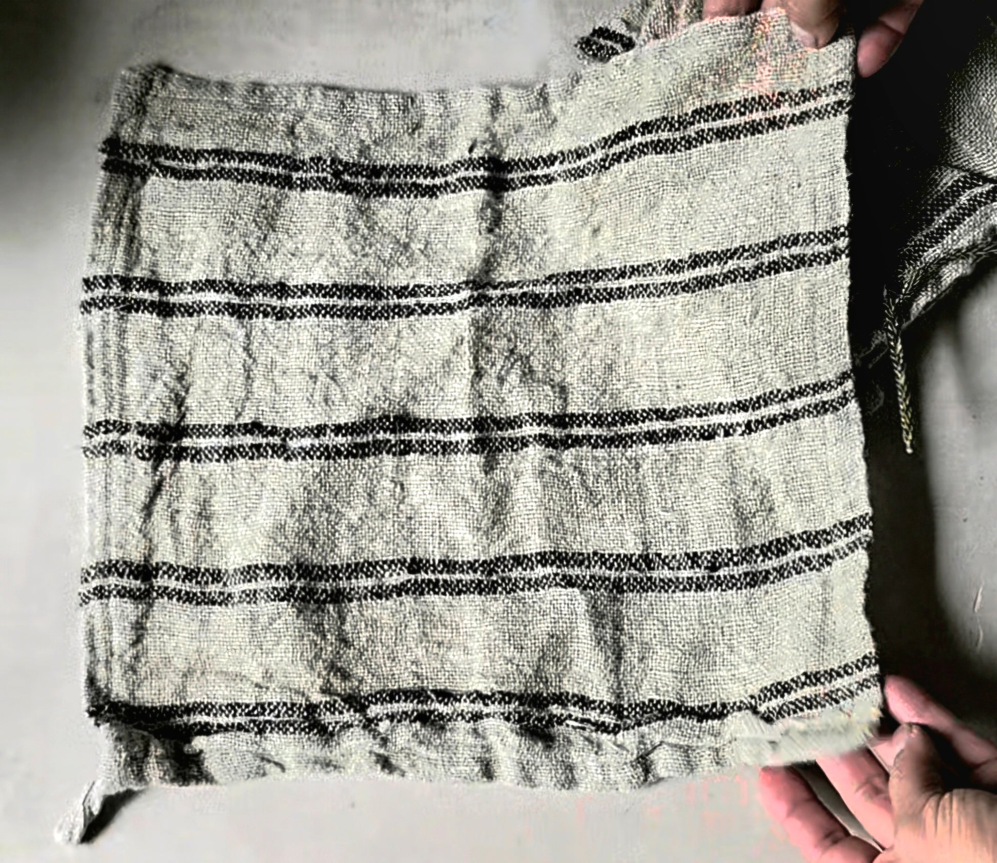 rustic handloomed 100% Linen Wash Cloth with black stripes and a loop to hang.
