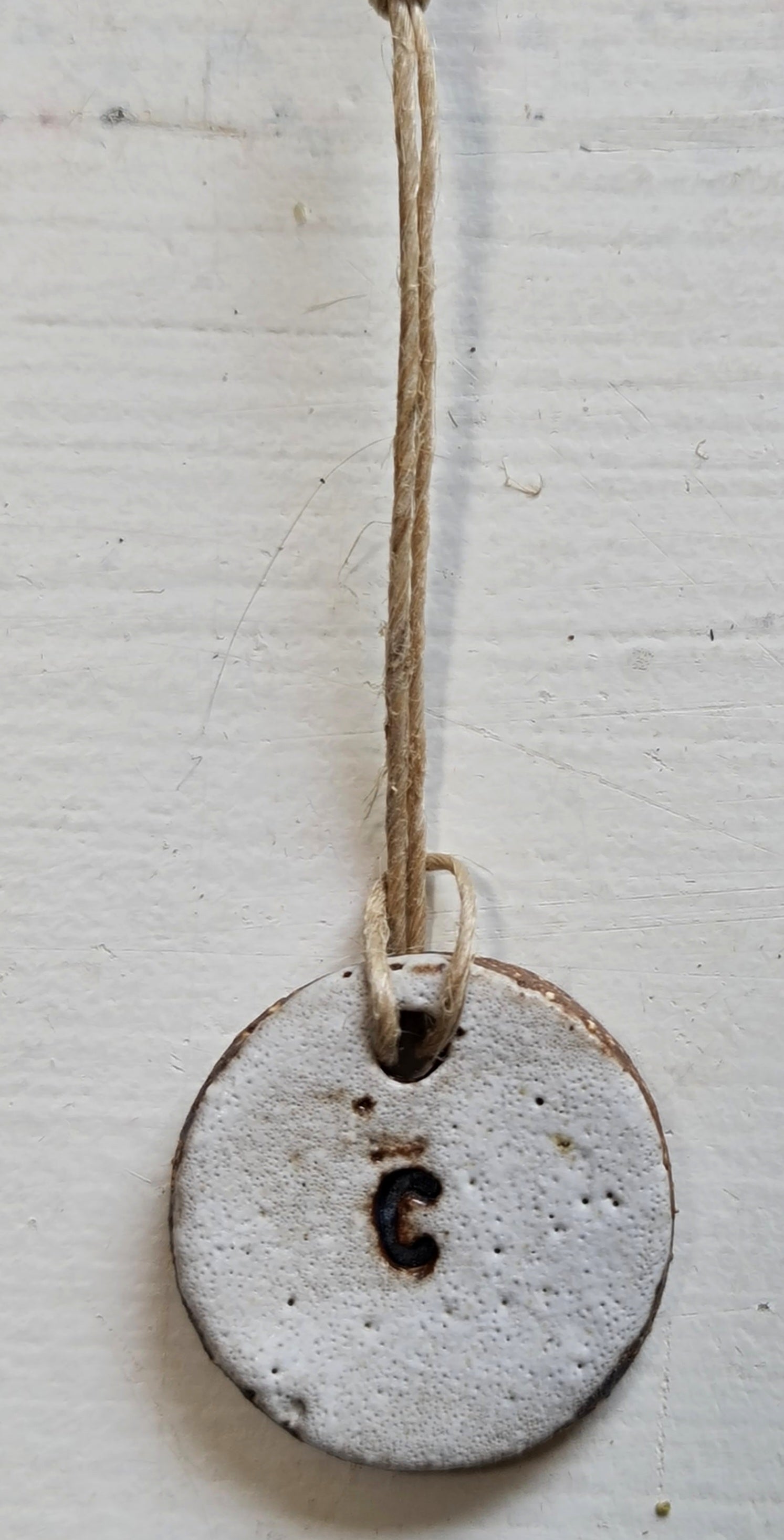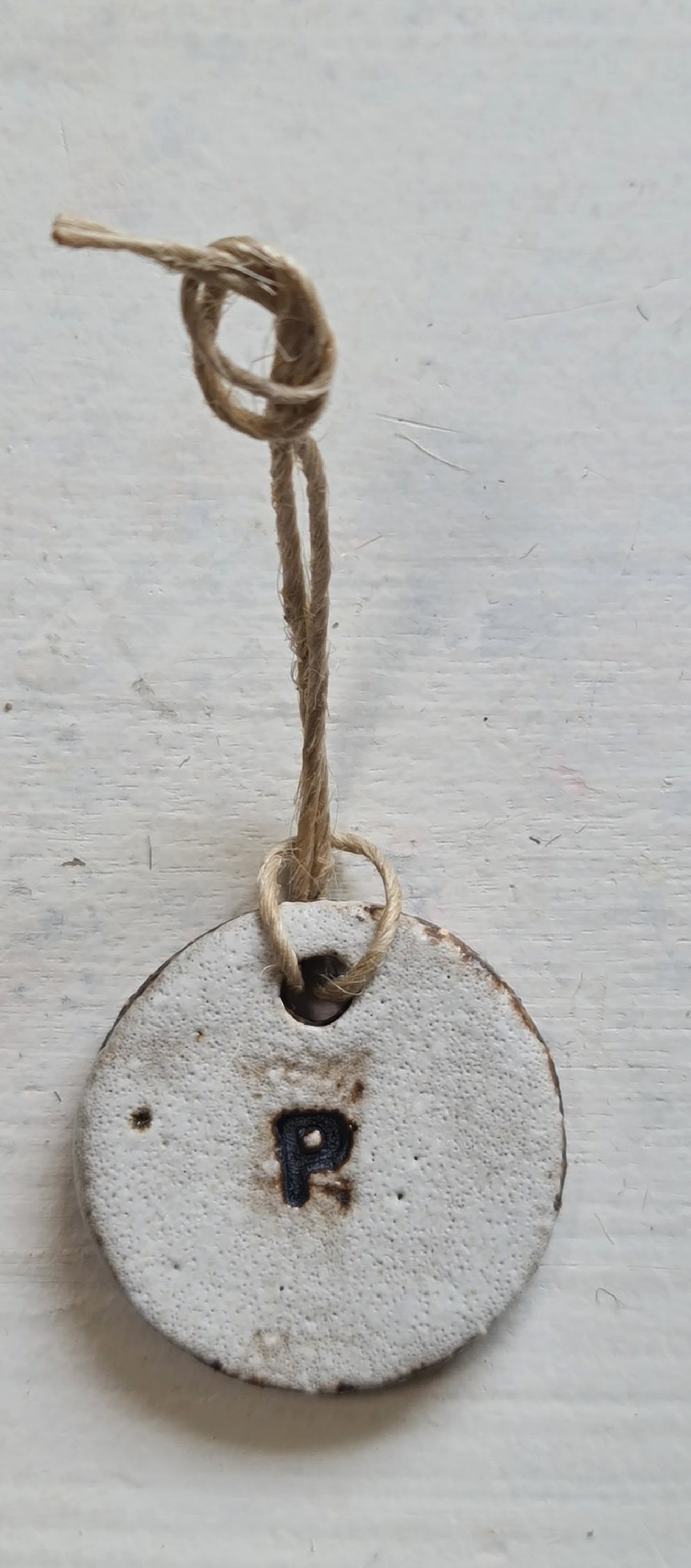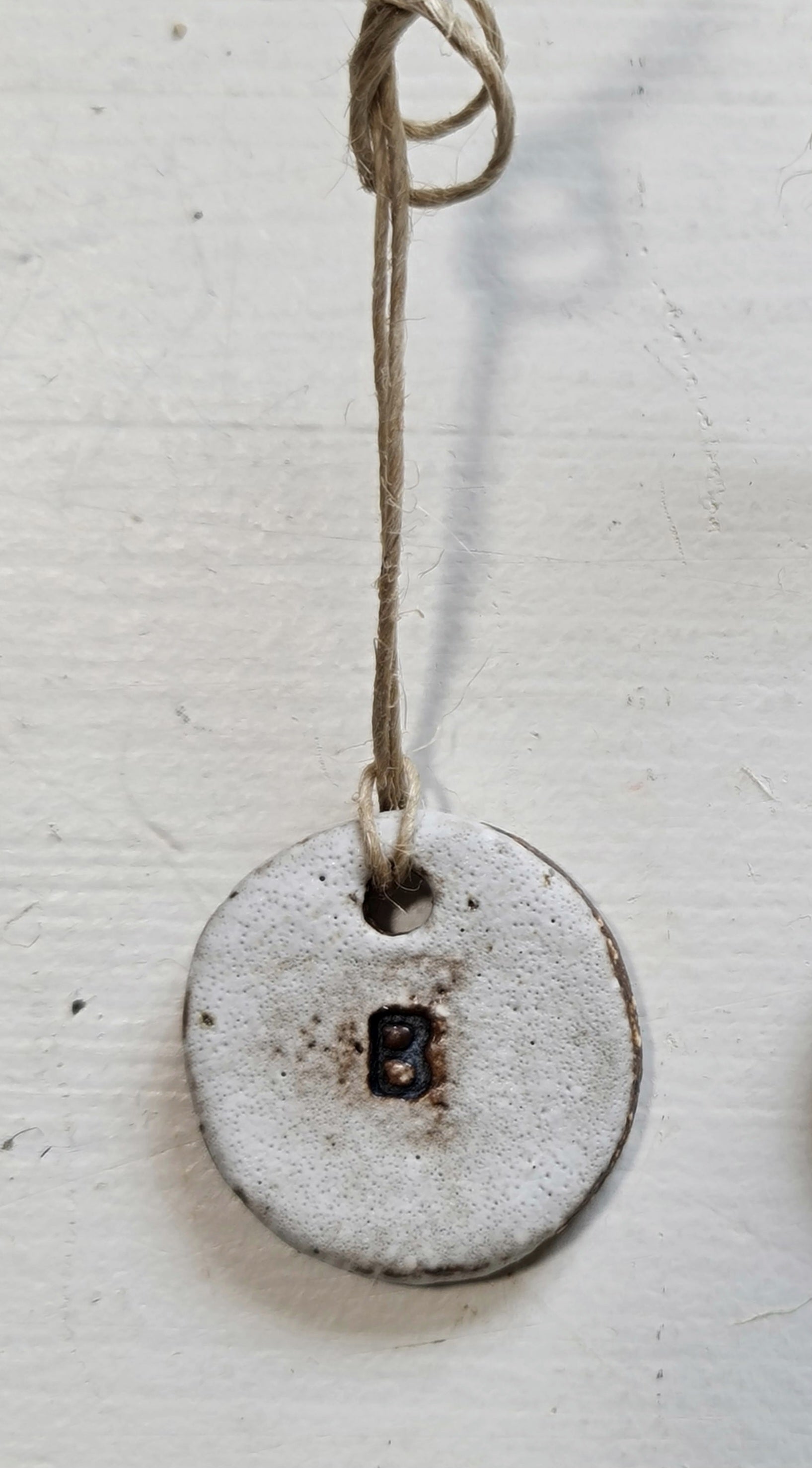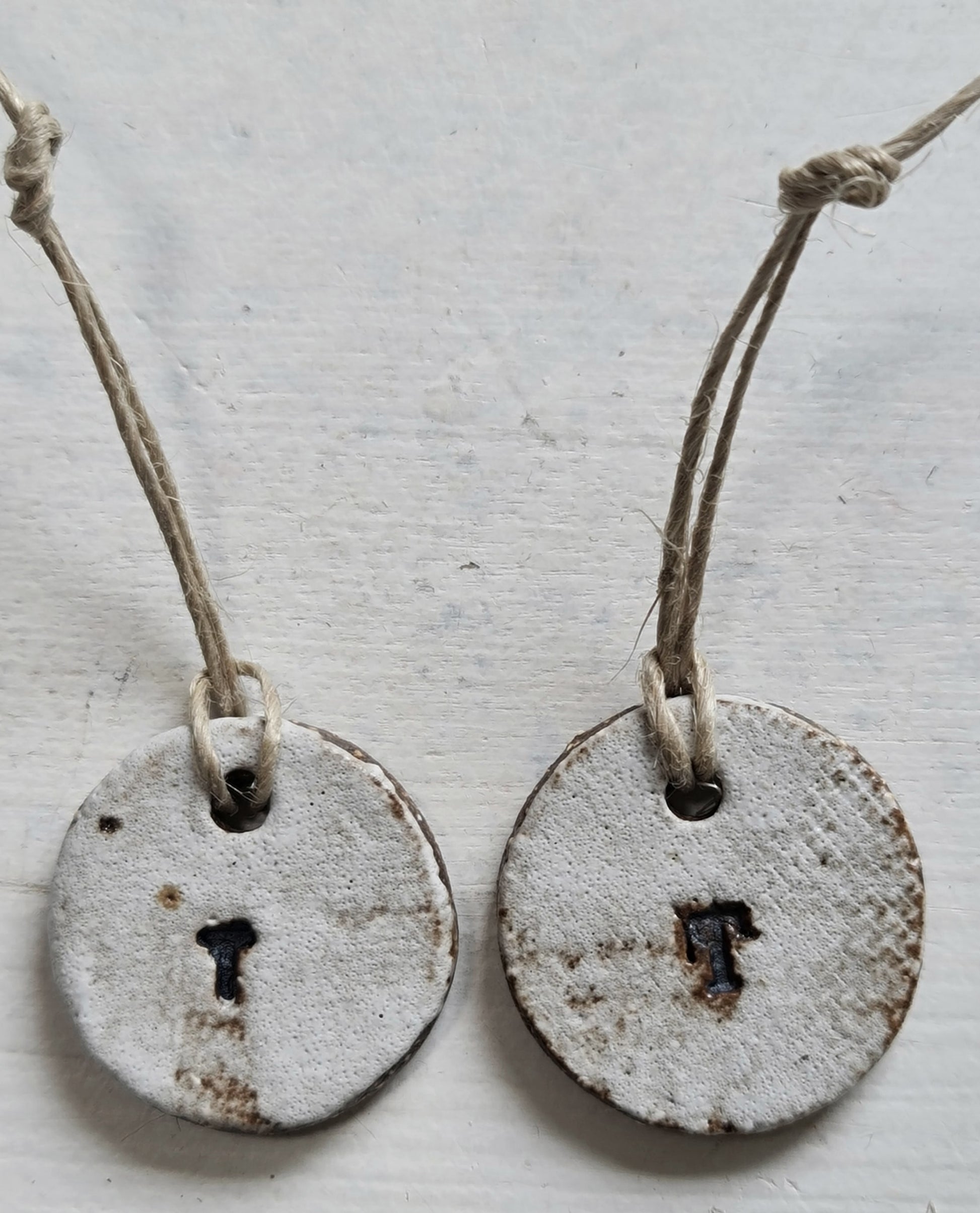 Rustic white letter ornaments with a natural jute tie. Perfect for gift tags on presents, it really does add that extra special touch. They also look great at the Christmas table setting for quest placement. Please note the font on some of the ornaments may differ. The black glaze in the initial imprint has blead out on some of the ornaments, they may not be as crisp however still identifiable. IF YOU PURCHASE MULTIPLE ITEMS I WILL TRY TO MATCH THE SURFACE FINISHING AS WELL AS THE FONT AS CLOSELY I POSSIBLY CAN.