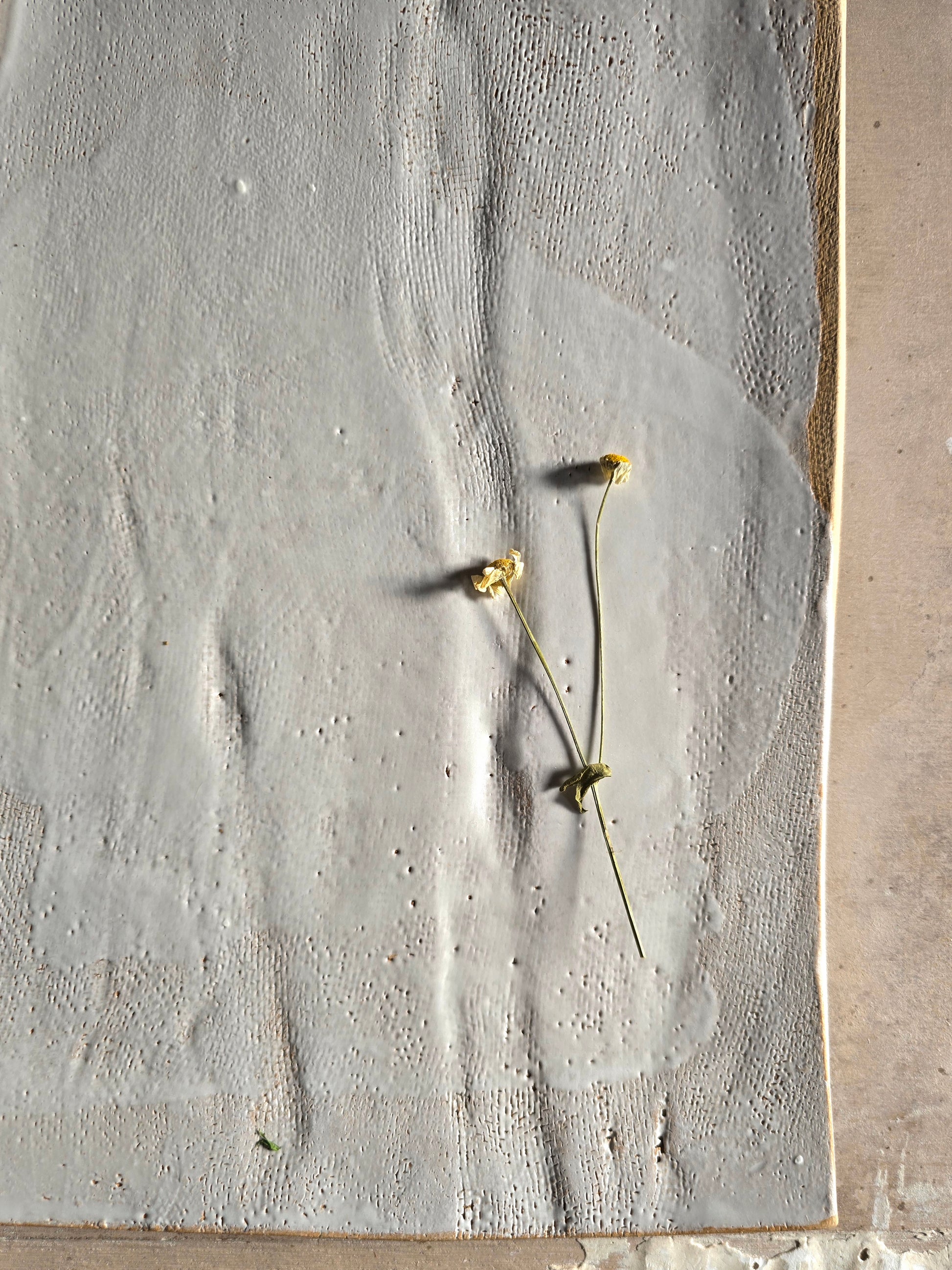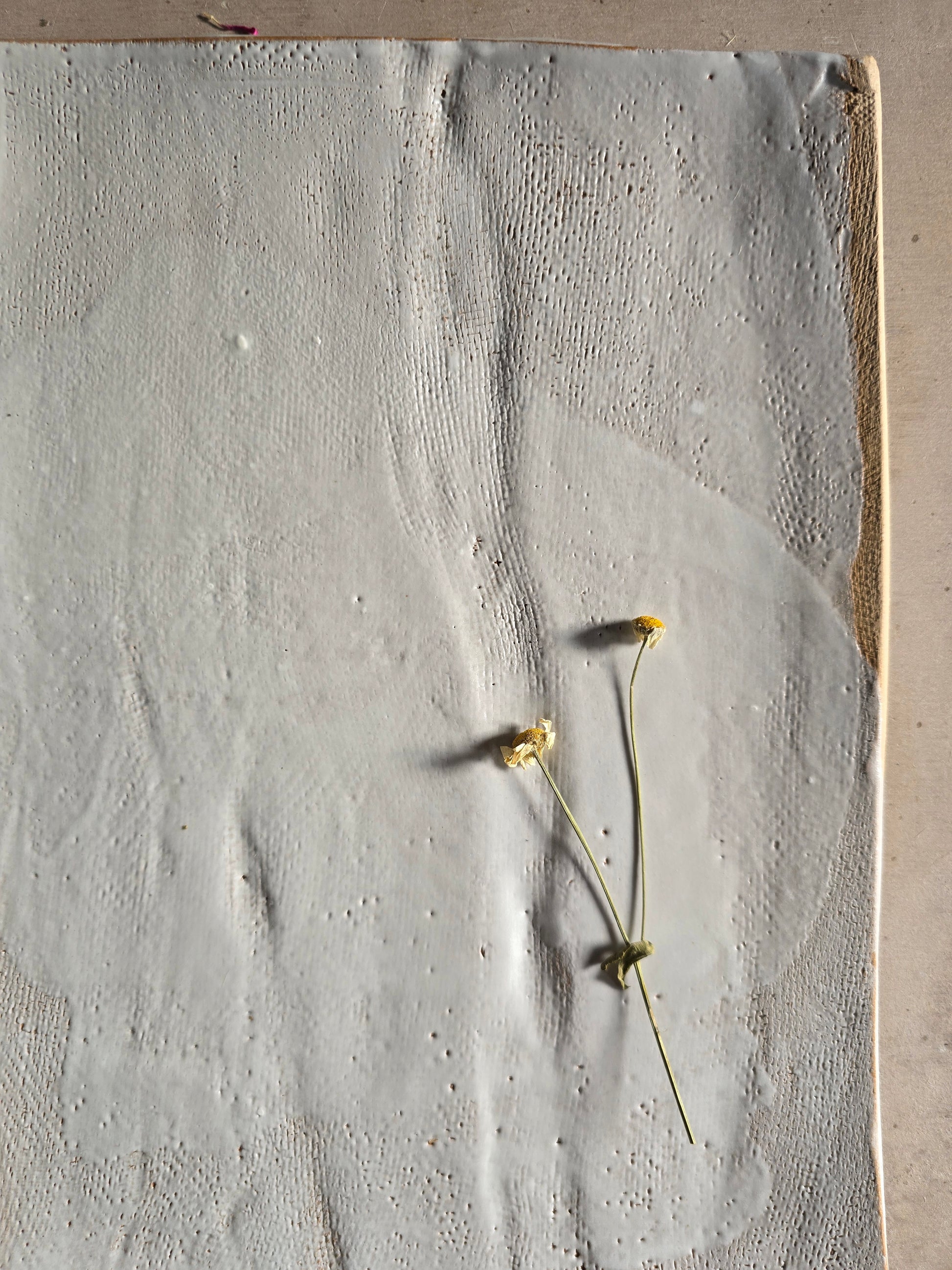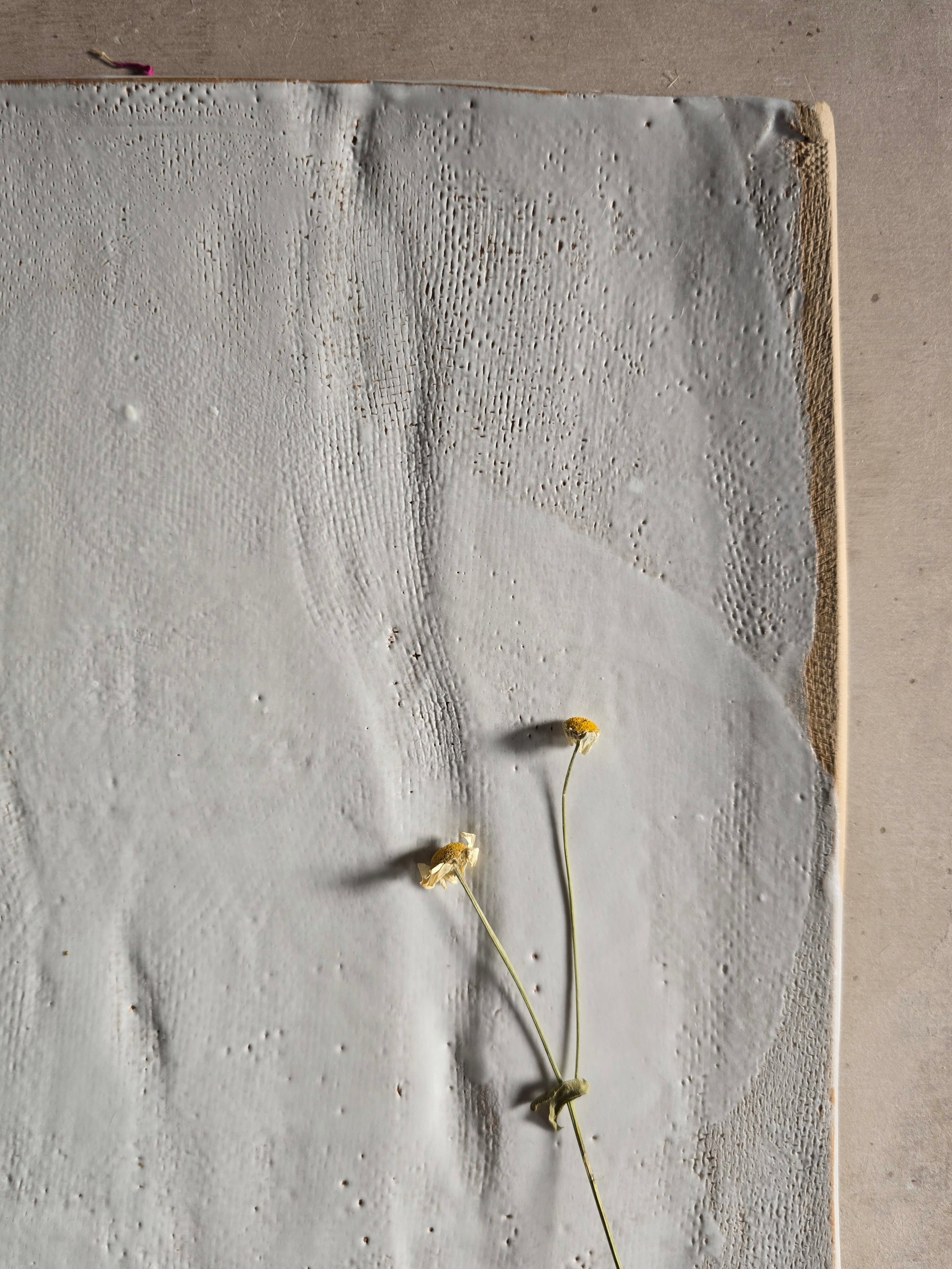 Elevate your entertaining with this handcrafted ceramic serving board, featuring a unique textured surface and rustic charm. Made from natural buff biscuit clay, this rectangular serving platter is artfully finished with varying depths of white clay to create an uneven, organic texture that adds both character and tactile appeal.