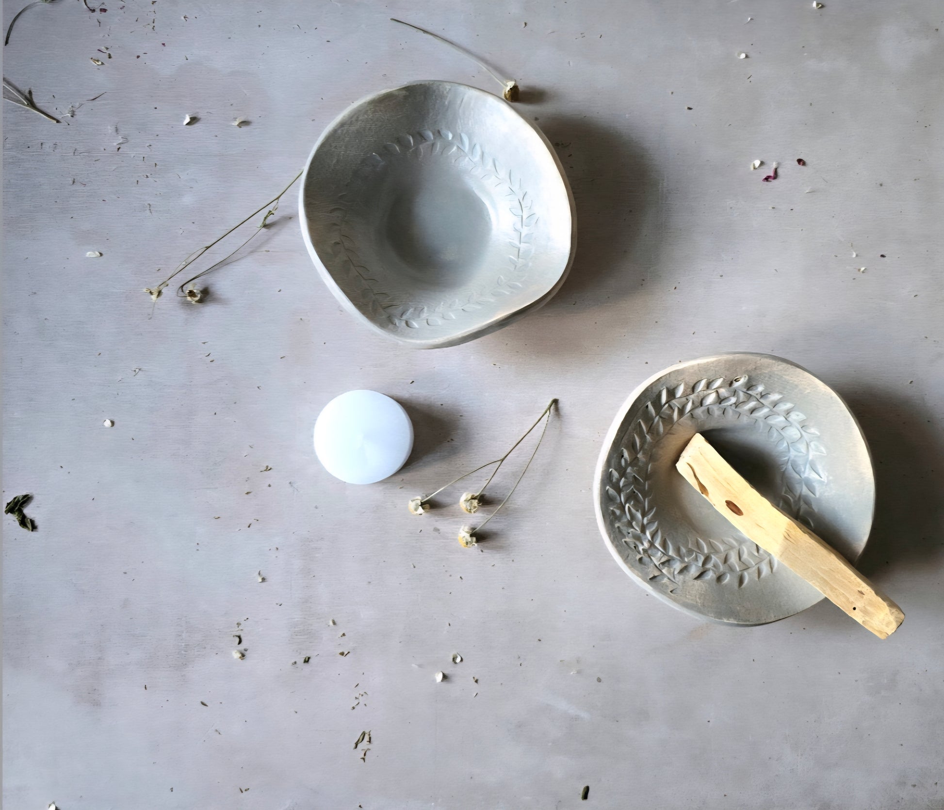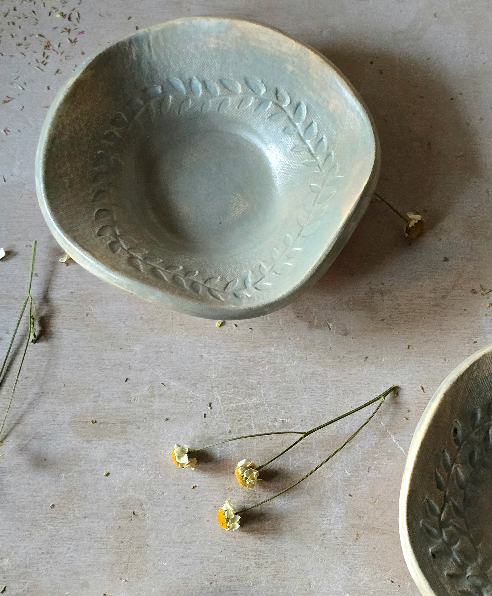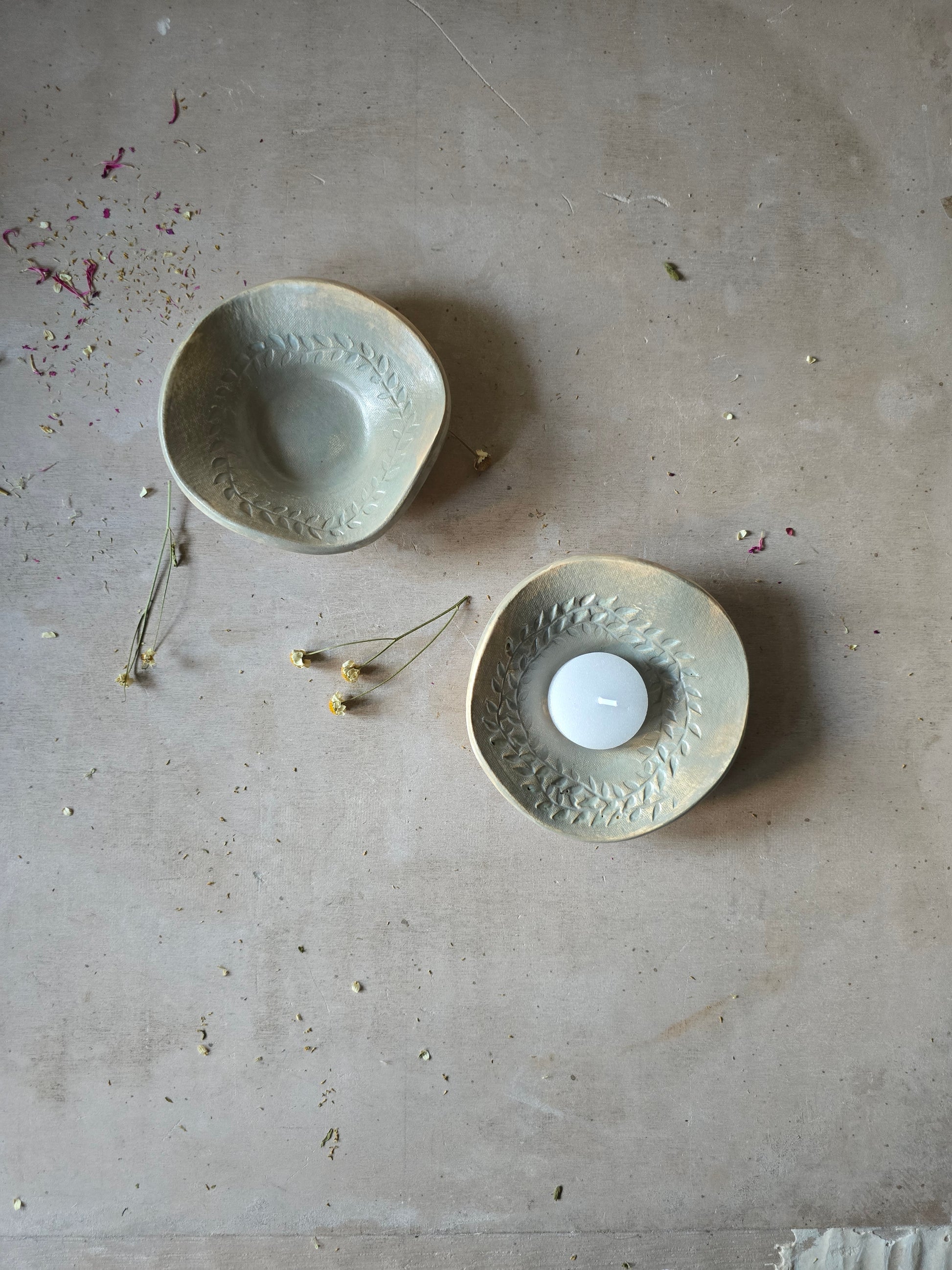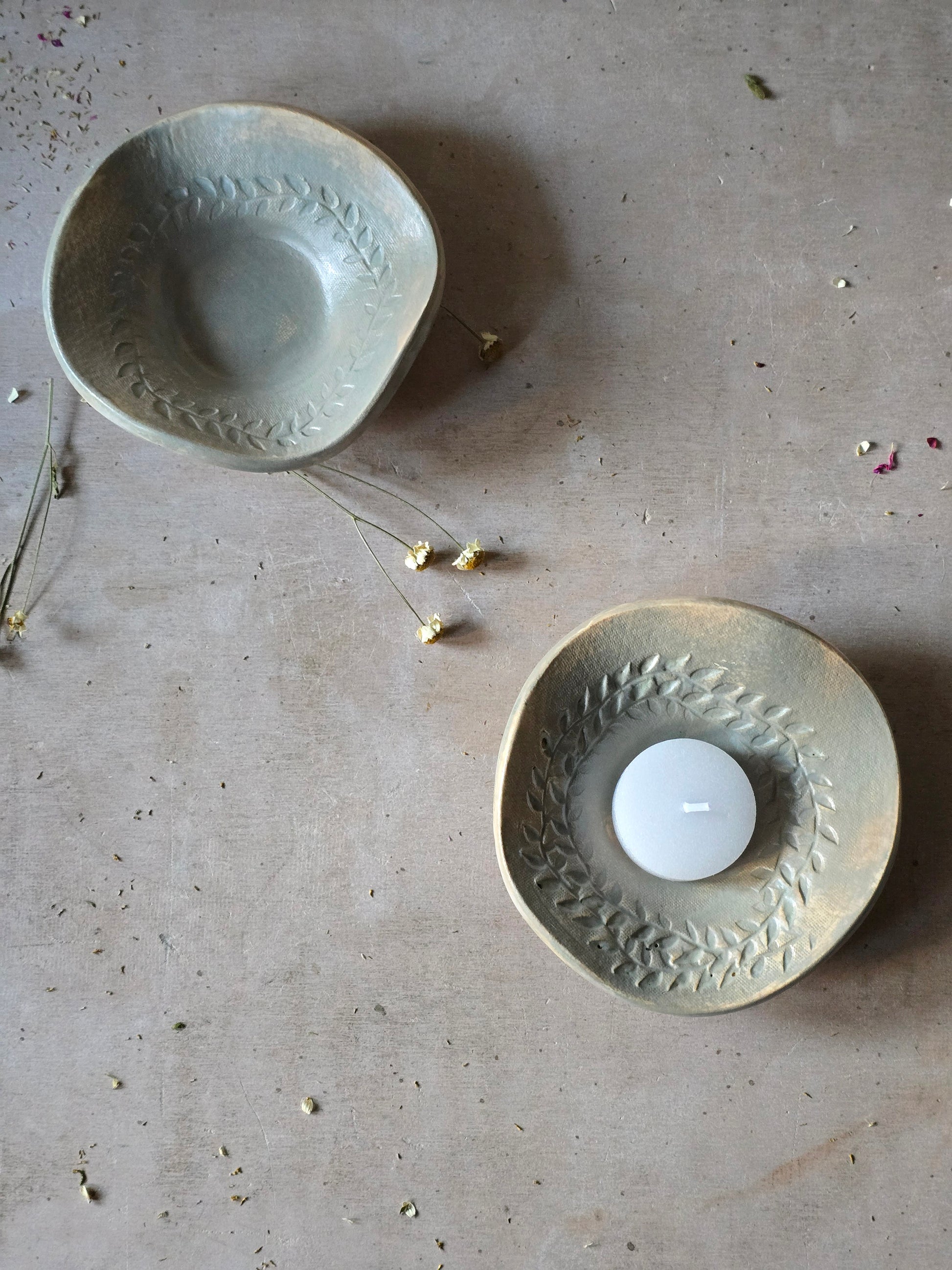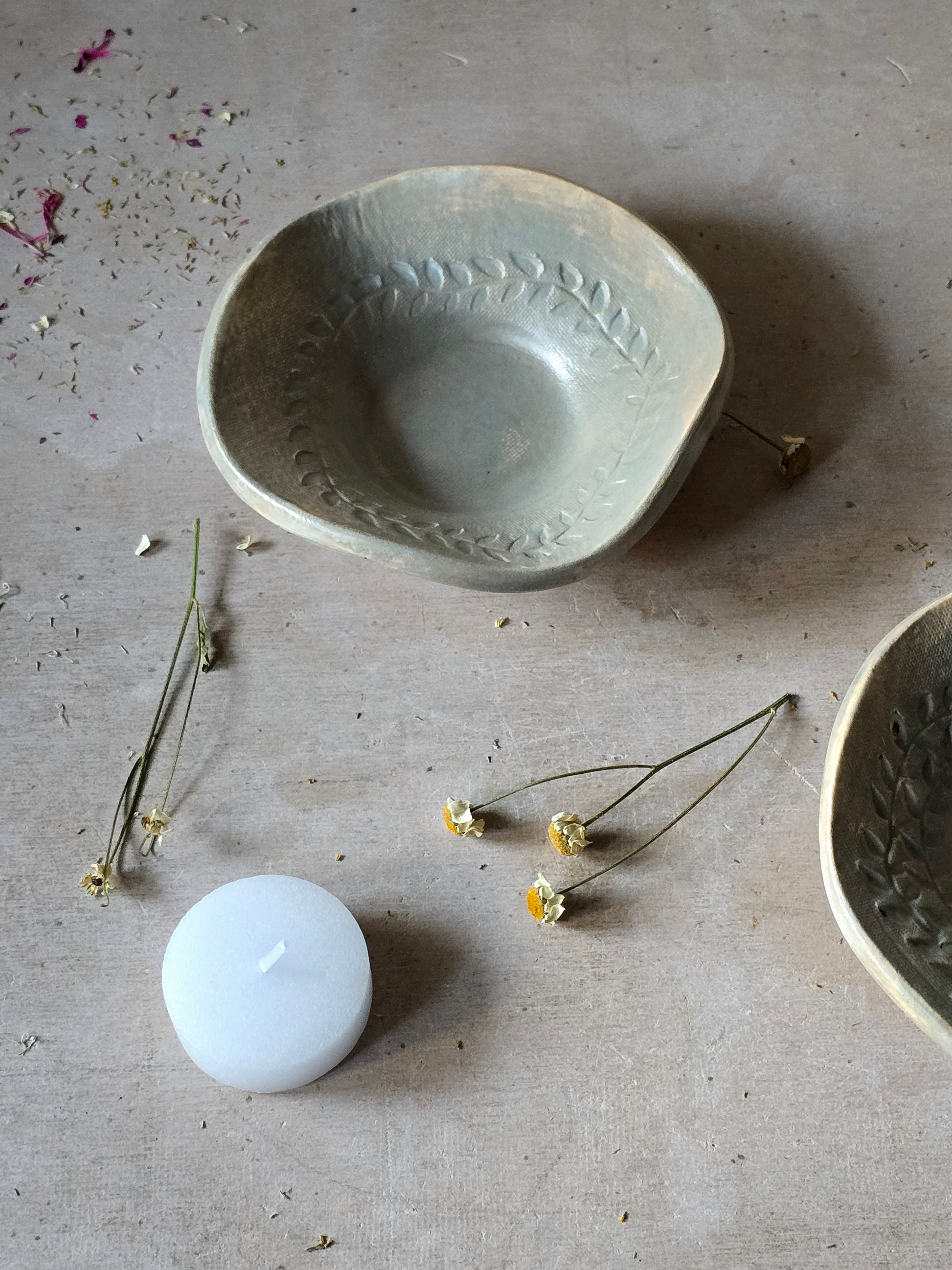 Add a touch of handmade charm to your home with this beautiful ceramic trinket dish in a soft sheer duck egg blue glaze. Featuring a delicate wreath leaf embossing, this small bowl is perfect for holding tealight candles, Palo Santo sticks, smudge sticks, or even jewellery and small keepsakes. The glaze reveals warm clay tones in subtle areas, giving each piece a unique, rustic elegance.