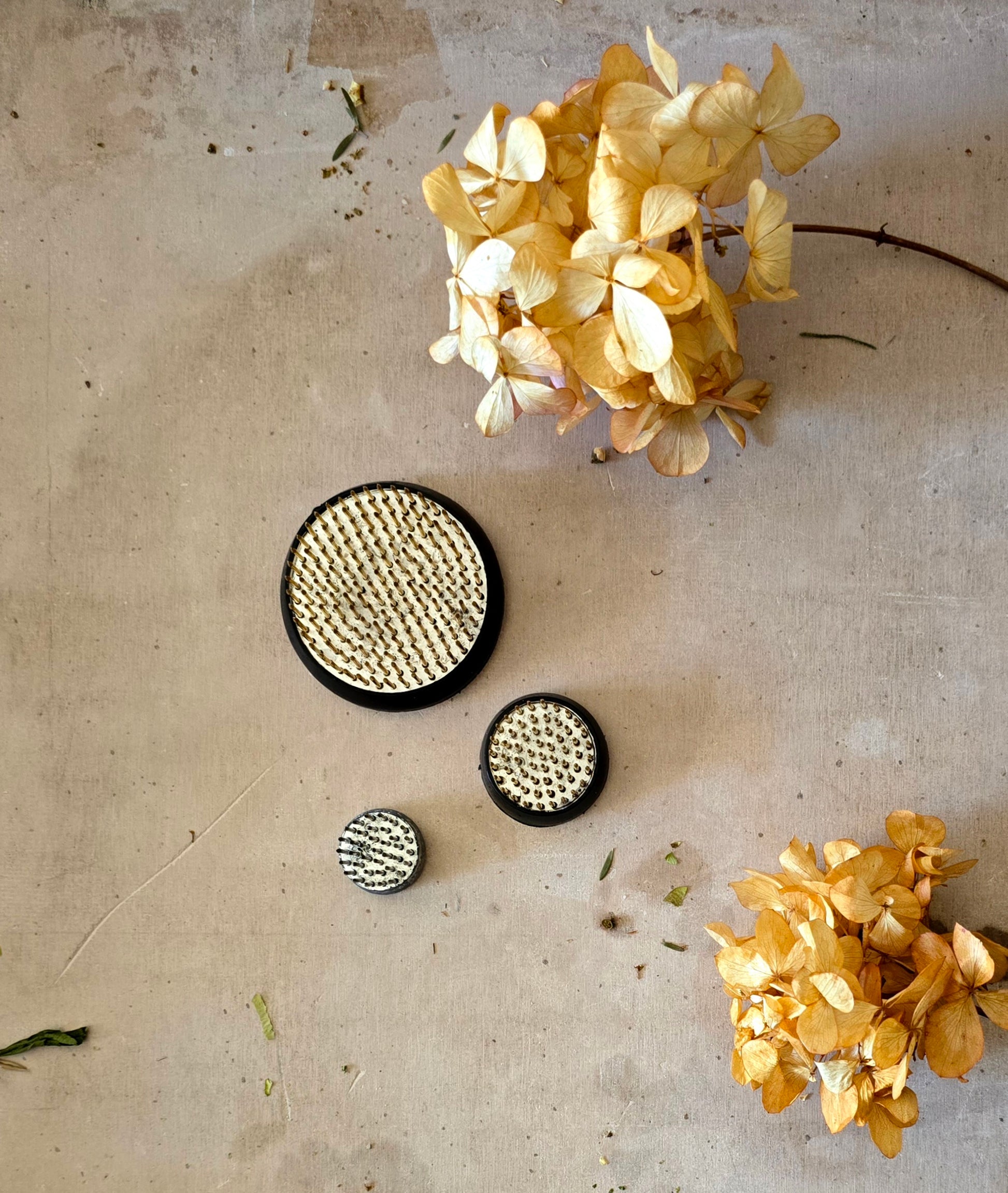 This Kenyan-made Ikebana pin frog is designed with long, dense needles and a durable 3.5cm metal and brass base. Equipped with a rubber gasket to protect your vase or bowl from scratches, it offers the perfect balance for small to medium-sized floral arrangements. Suitable for slightly thicker stems, this medium kenzan weighs around 70g and brings a refined touch to Japanese floral art and modern arrangements alike.