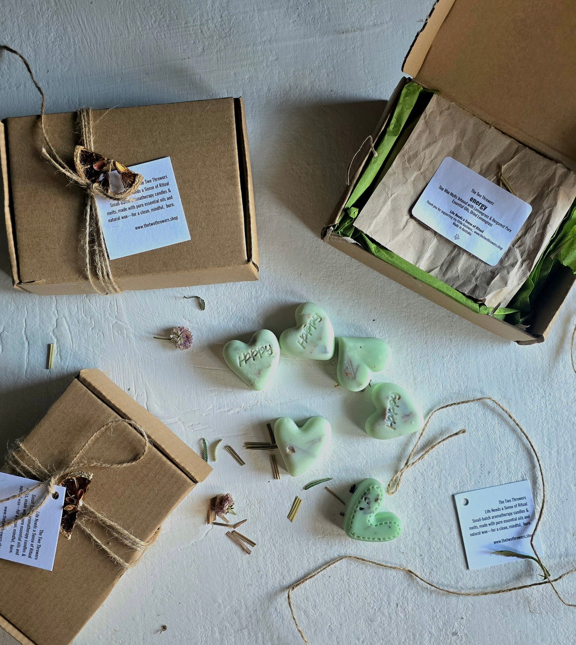 Transform your space with our handcrafted Lemongrass & Bergamot Soy Wax Melts, made in small batches for quality and freshness. Infused with pure essential oils and dried lemongrass botanicals, these melts deliver a strong, long-lasting scent with a refreshing citrus and herbal blend. A touch of candle dye adds a hint of color for an elegant touch. Six Soy heart shape Pure Essential Oil wax melts in a box... approximate weight 75g.