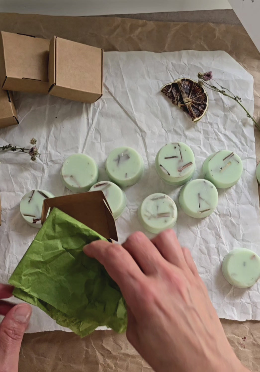 These melts deliver a strong, long-lasting citrusy scent that effortlessly transforms your home, spa studio, or workspace into a soothing retreat. Lemongrass & Bergamot oil are known for its mood-boosting, uplifting and easing stress properties, making it perfect for moments of relaxation or rejuvenation. Made in small batches for added freshness. One round wax melt in a box, approximately min.. weight 20g. Beautifully boxed, making it a perfect gift. Inexpensive way to test different scents or to create your own signature scent by mixing different scented wax melts.