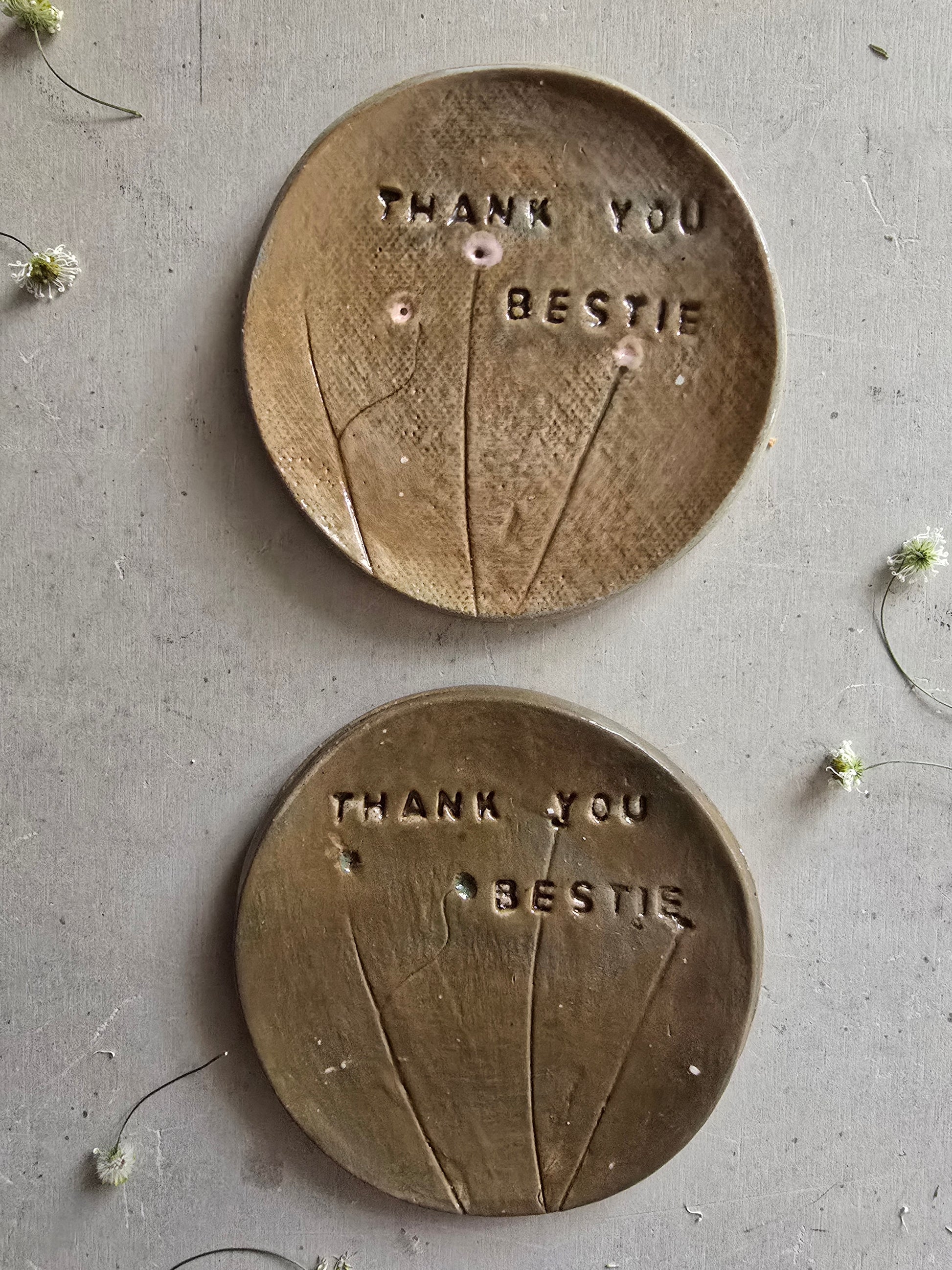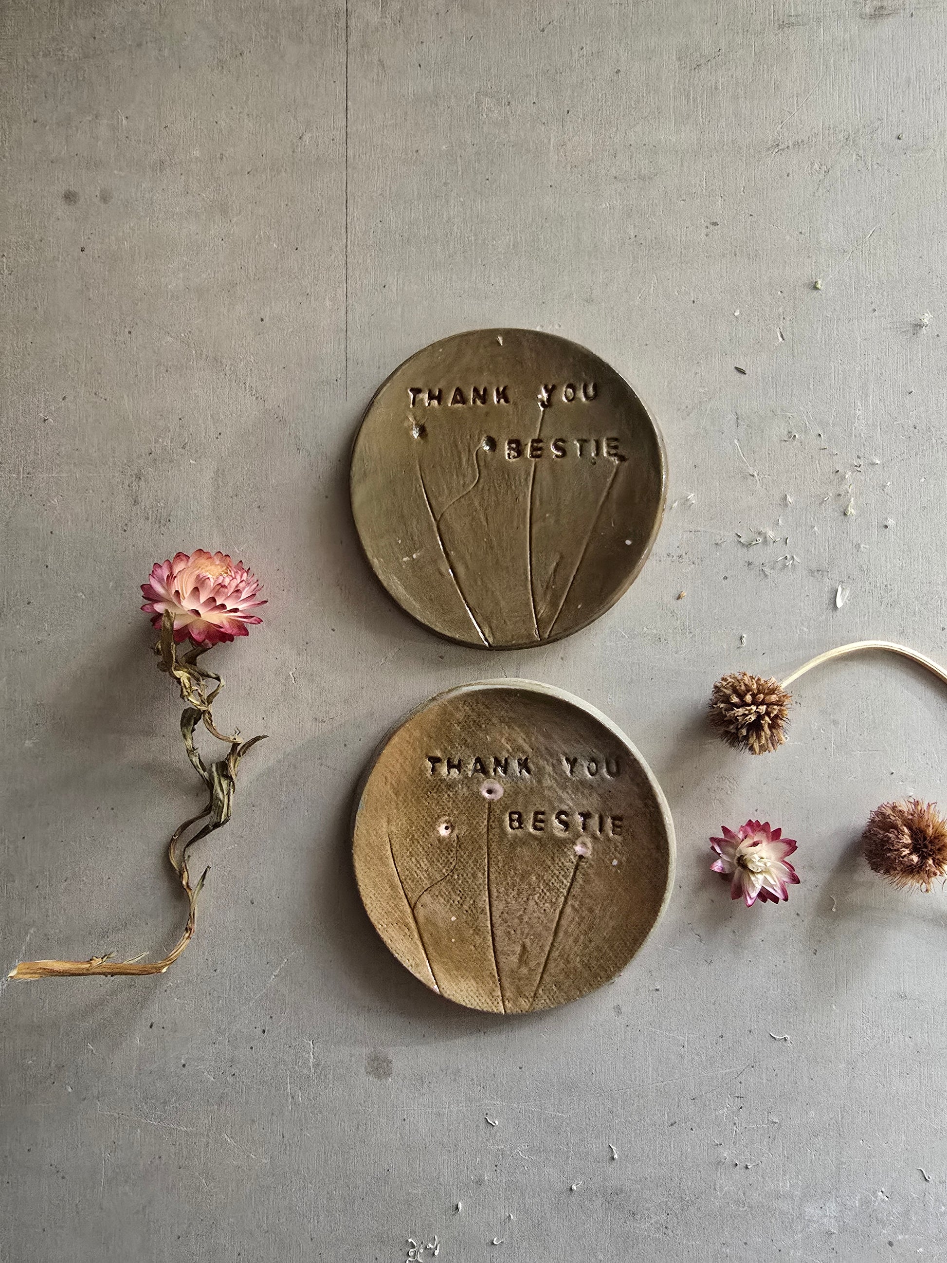 Show your bestie just how much they mean to you with this unique, handmade pottery trinket dish – a beautiful token of friendship they’ll treasure every day. Crafted with love, each dish features a delicate flower stem imprint and is hand-stamped with "Thank You Bestie" directly into the clay.