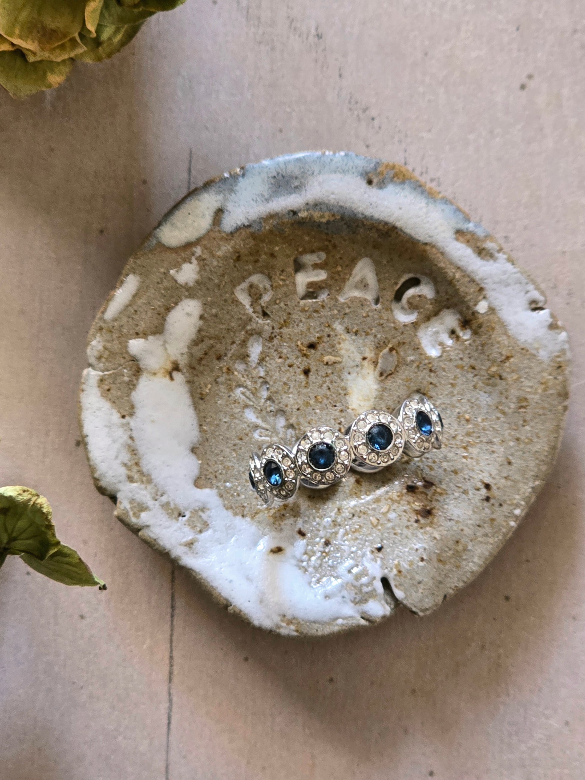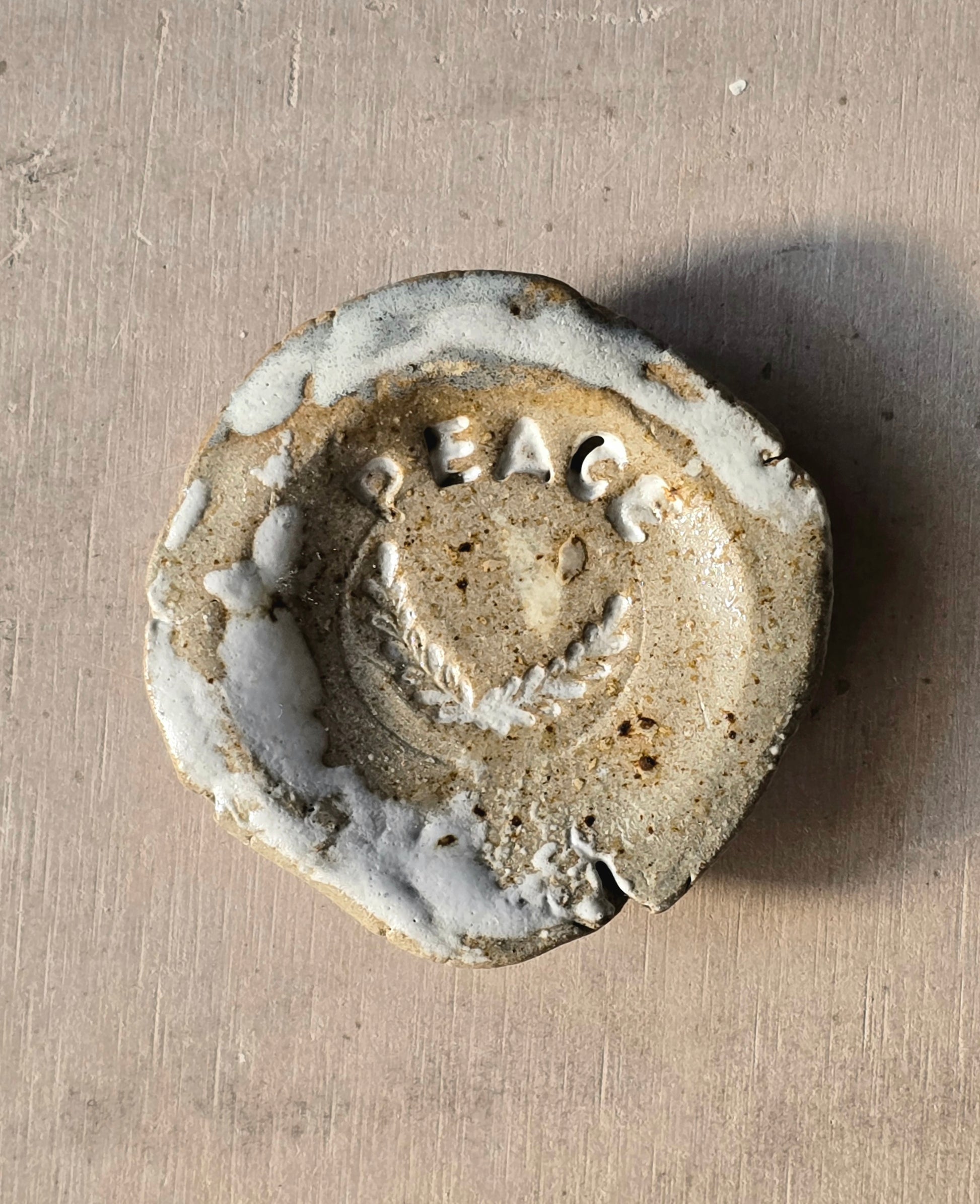 A small, round dish with the word Peace and a pair of joining olive branches stamped into the clay. Crafted from mottled grey clay with a partial white glaze finish for a beautiful, understated look. A symbolic gift for someone special — lovely as a ring dish or tealight holder.
