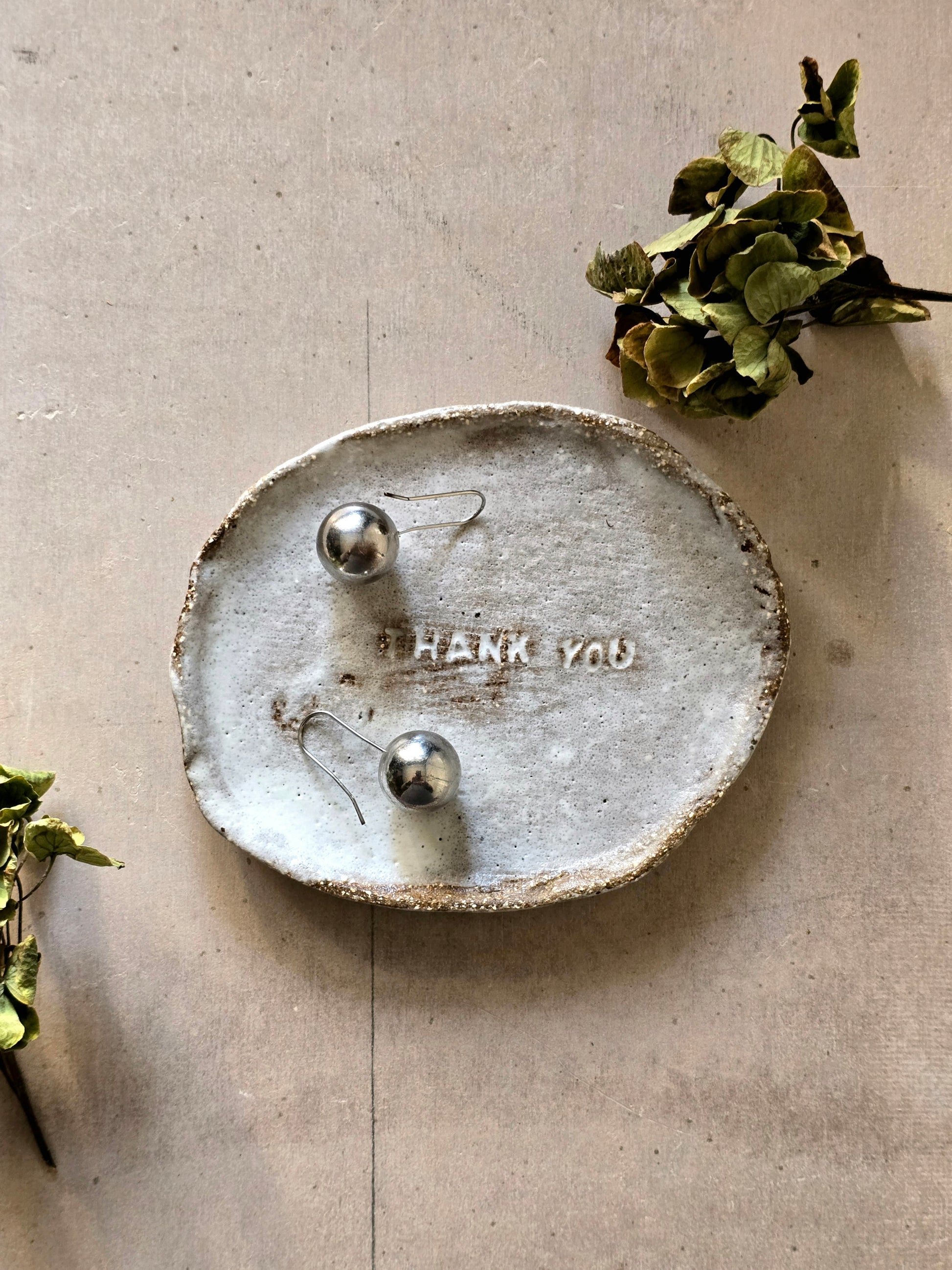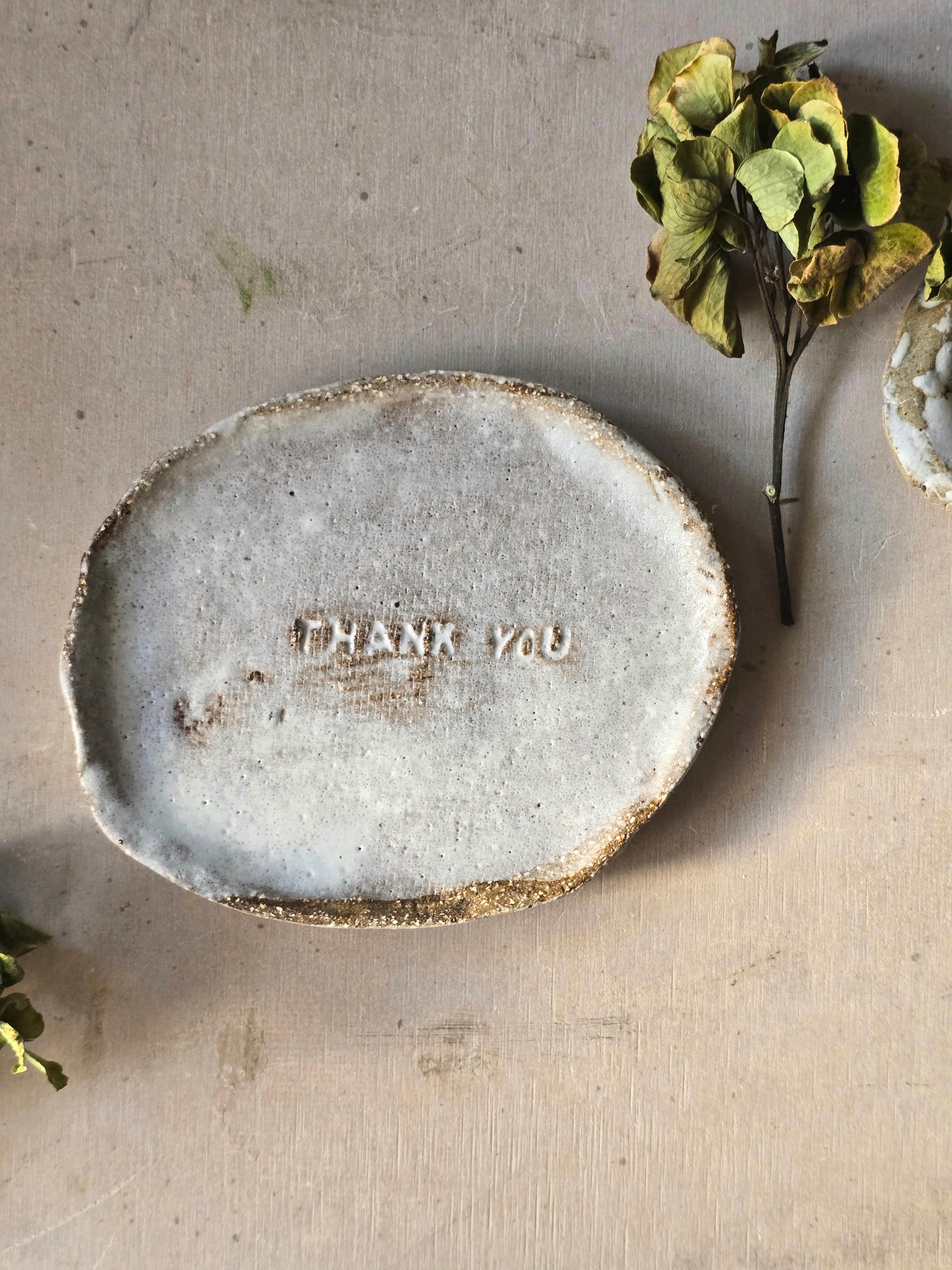 An organically shaped round dish made from biscuit-flecked clay, featuring Thank You impressed into the clay and finished with a matte white glaze. A versatile piece — perfect as a soap dish, jewellery holder, or for snacks, candles, or nibbles.