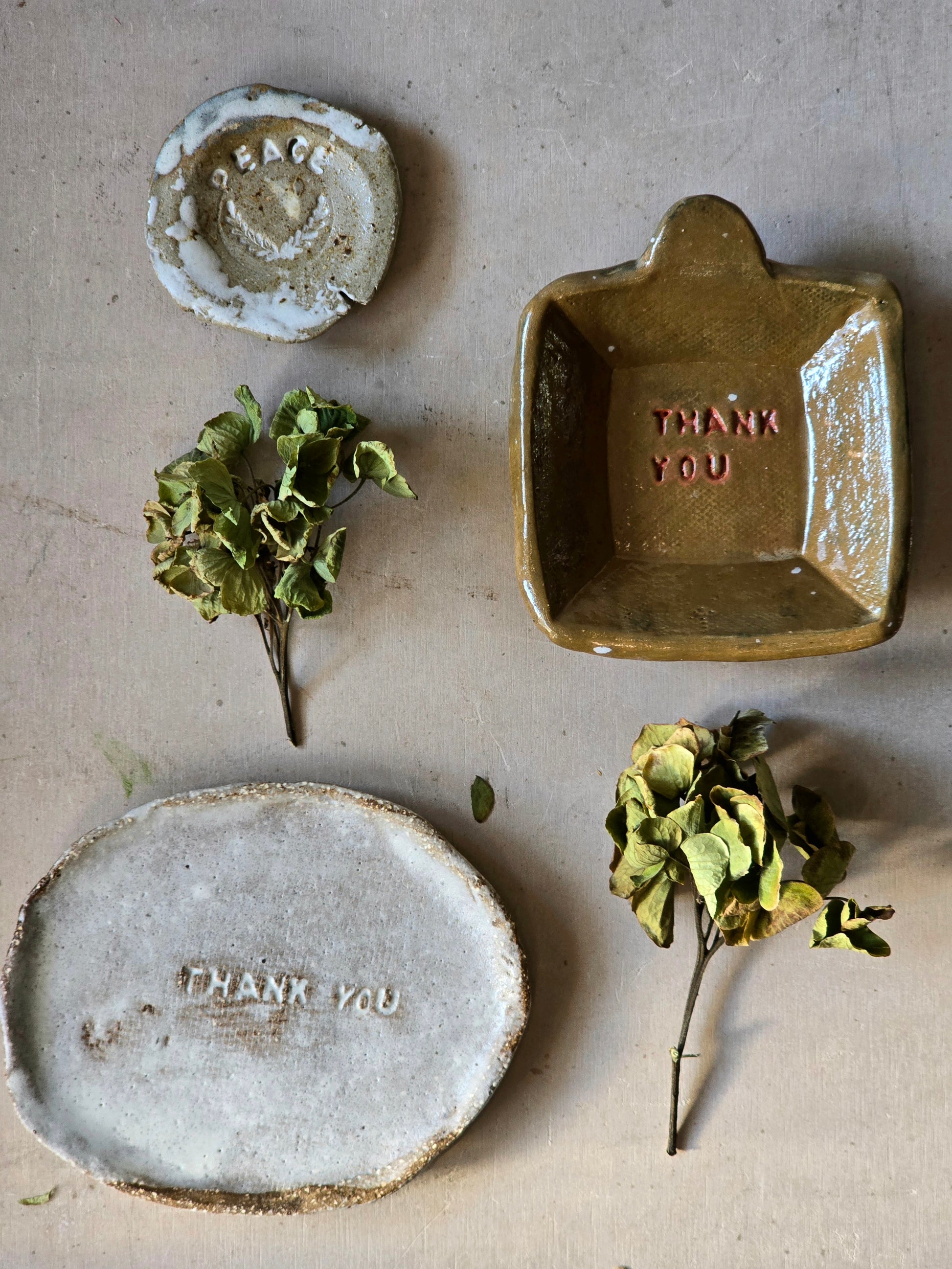 A beautiful collection of handmade organic pottery dishes, each one unique and stamped with a heartfelt message — perfect for gifting or treating yourself.