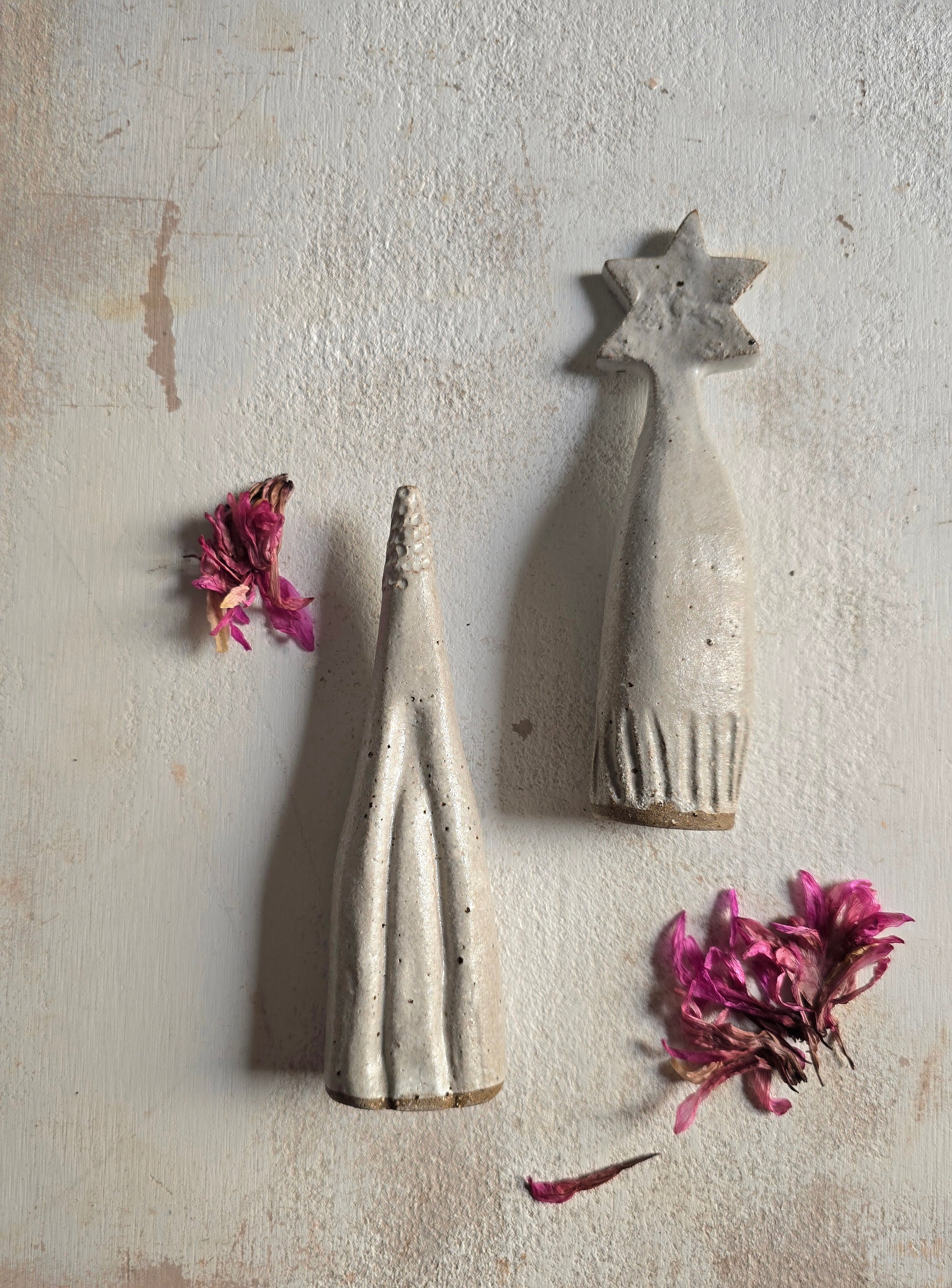 An organic triangular form finished in matte white glaze, its peak crowned with an embossed deer motif five-pointed star. The glaze’s gentle translucence speaks of light and renewal — a quiet symbol of transformation and rebirth through life’s changing seasons.