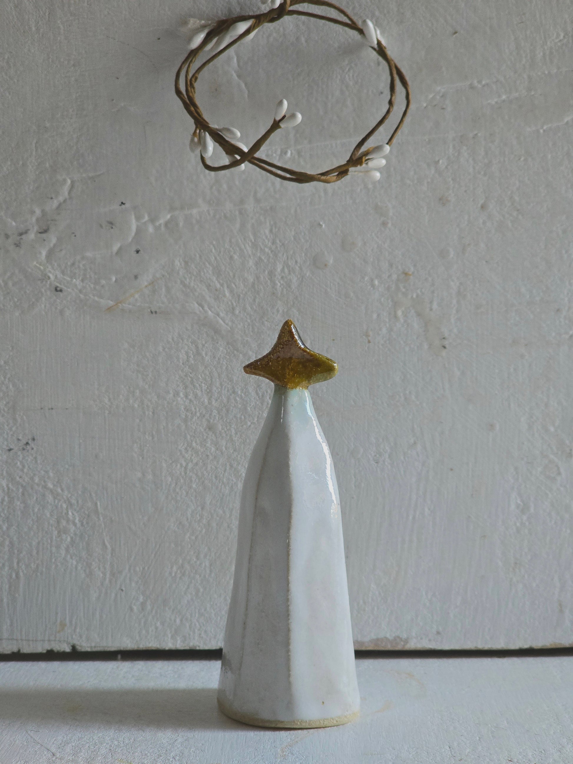 Hand-carved facets shape a glossy white cloak that catches the light with subtle movement. At its crown, a three-pointed twinkle star shines in olive-gold — a tender reminder of innocence, trust, and quiet joy.