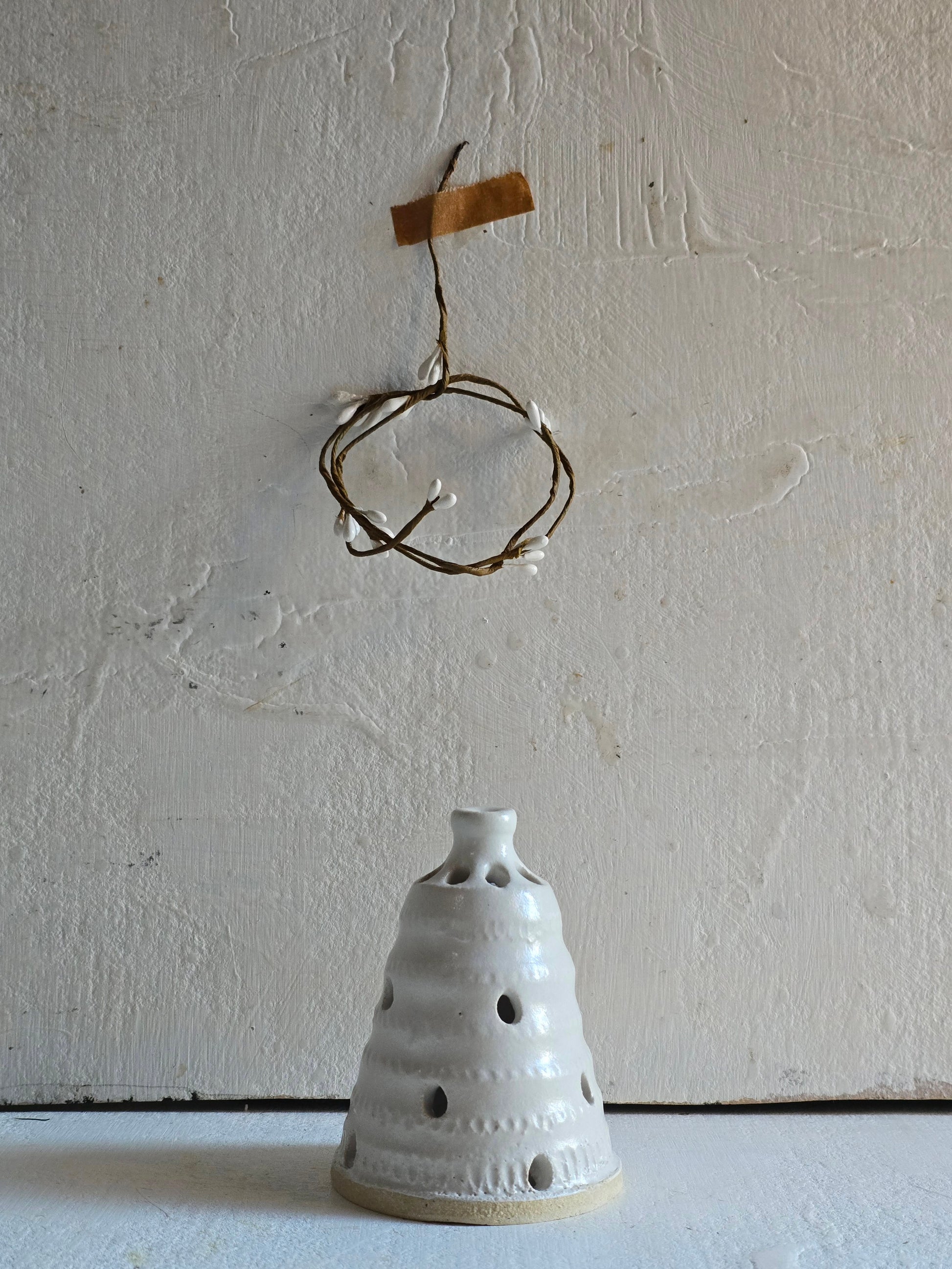 Evoking soft winter mornings, The Snow-Covered Bell features a smooth satin white glaze with subtle sheen. Its conical body and gentle-faint impressions of a string of lights around the surface — a quiet celebration of simplicity and seasonal warmth.