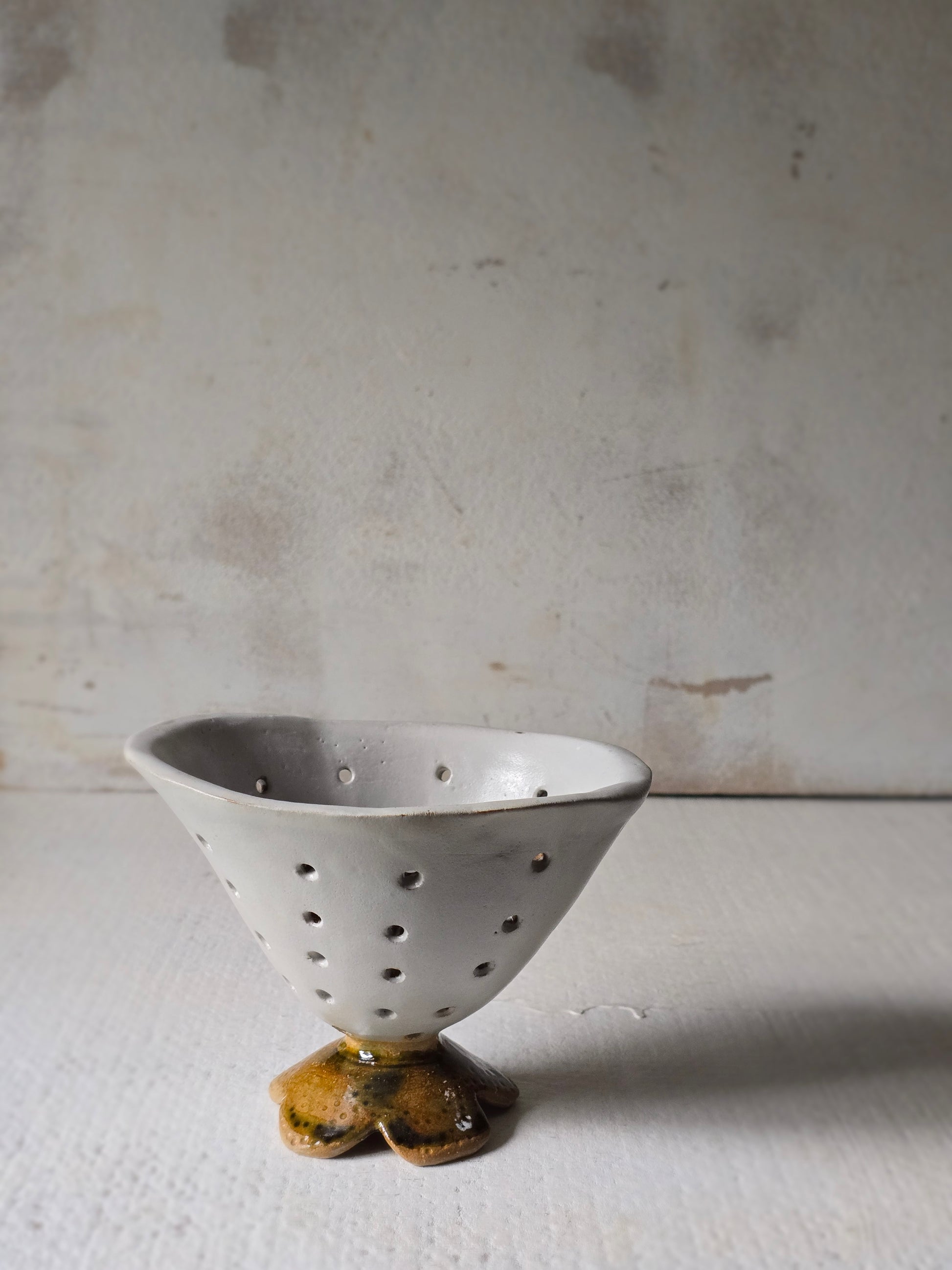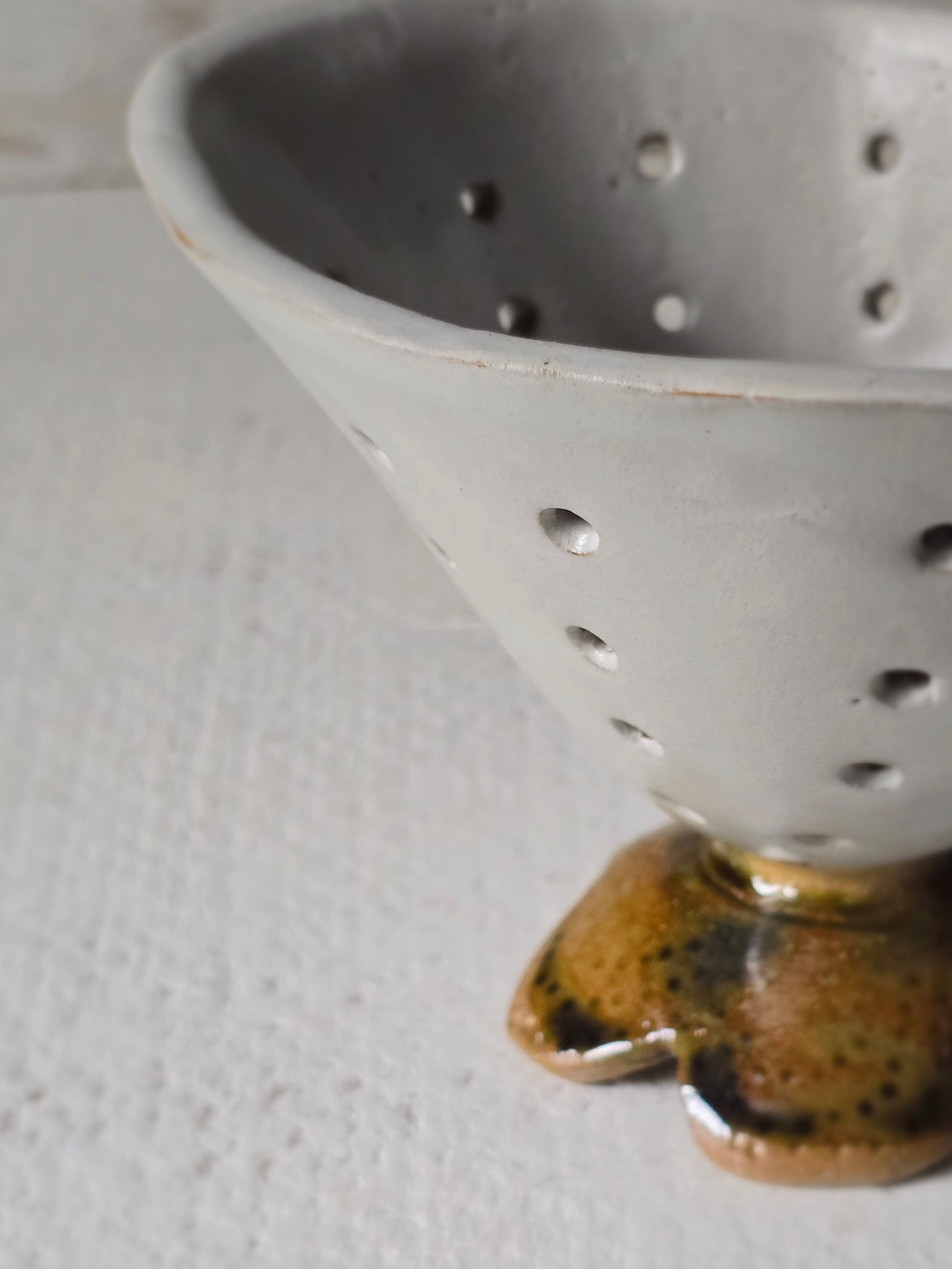 Playful and organic, The Olive Skirted Colander features a soft matte white glaze and a scalloped foot edged with dotted impressions in olive green, gold and sprays of midnight blue. Each one-of-a-kind form is shaped by hand bringing authentic charm and uniqueness.